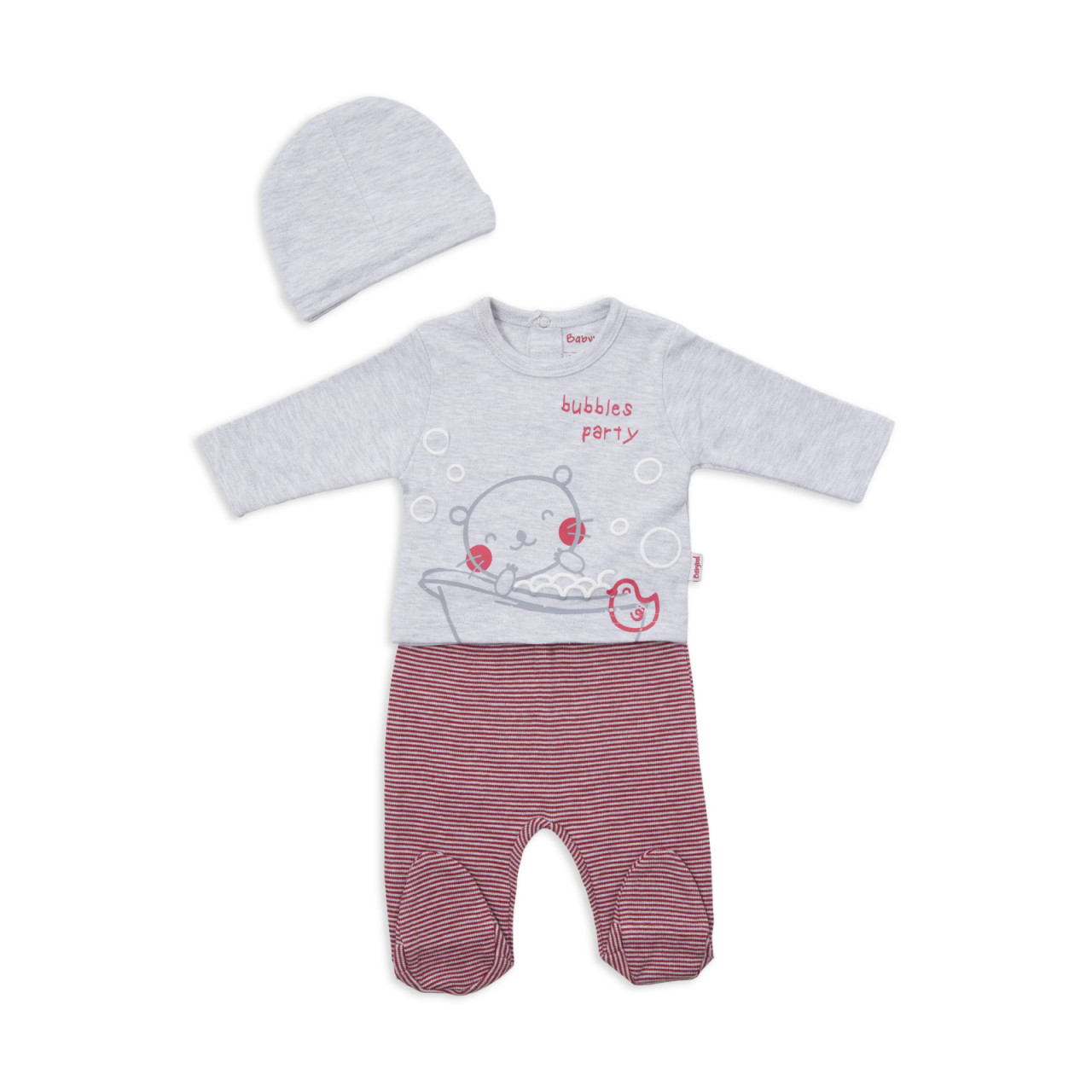 Set confortabil pentru baieti nou nascuti din bumbac moale, format din tricou cu maneca lunga cu inchidere pe spate cu capse, pantaloni cu botosi , dungi rosii si caciula gri .
