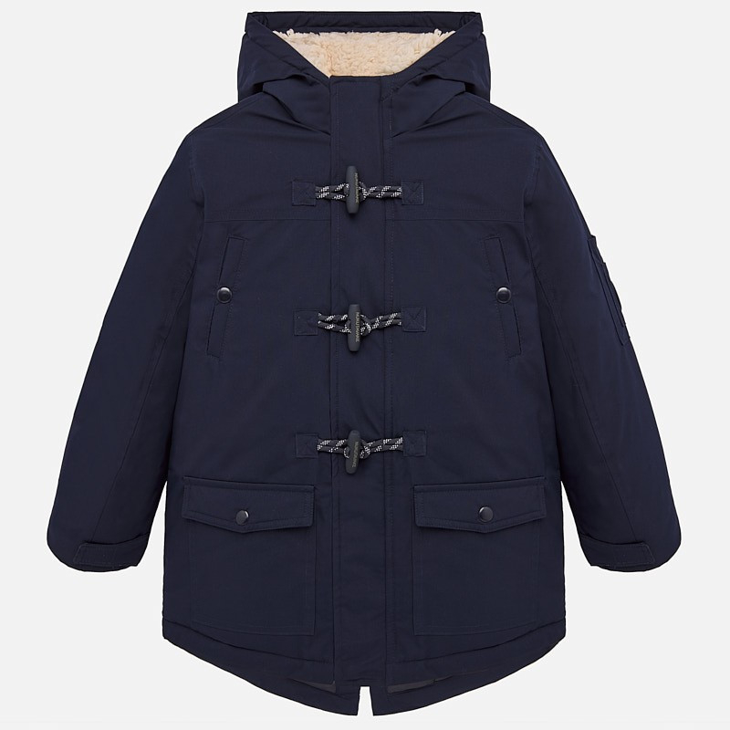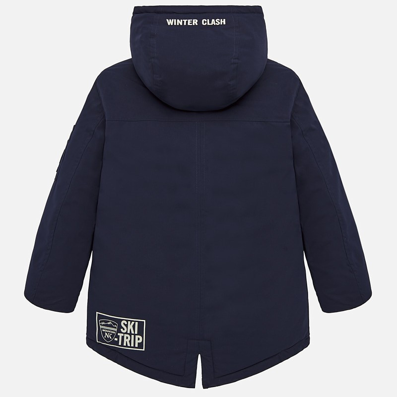 Geaca lunga baieti de la Mayoral, blanita la interior, foarte usoara, gluga nedetasabila, inchidere dubla cu fermoar si butoni.Brand MayoralMade Spania