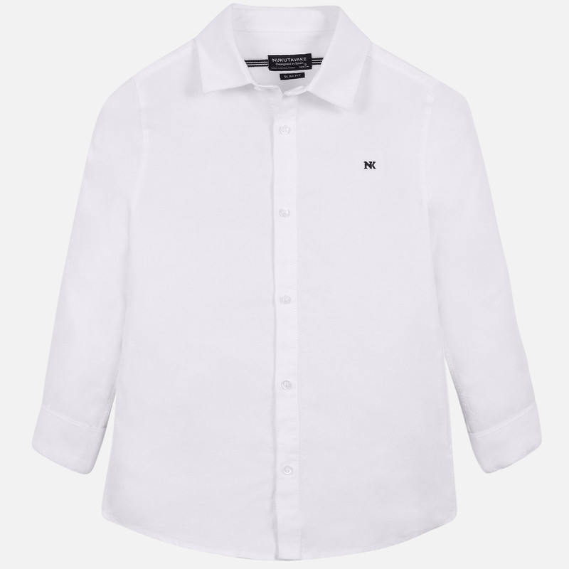 Camasa maneca lunga scoala pentru baieti de la Mayoral. Modelul are buzunar frontal si broderie discreta. Mici nasturi. Material placut din bumbac.