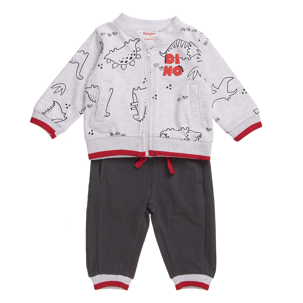 Trening baieti bumbac format din jacheta cu imprimeu dinozauri, inchidere cu fermoar, buzunare laterale si pantaloni regular fit, banda elastica si siret in talie, buzunare laterale, manseta elastica. Brand Babybol