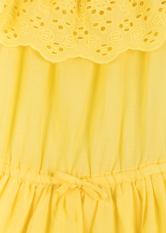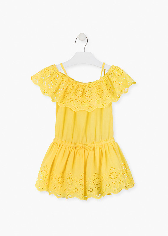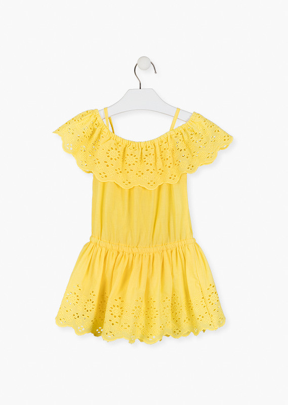 Rochie superba de vara cu bretelute fine pentru fetite 2-7 ani, model cazut pe umeri, o broderie sparta orneaza frumos rochia la umeri si poale. Capuseala subtire de bumbac la interior. Brand LOSAN
