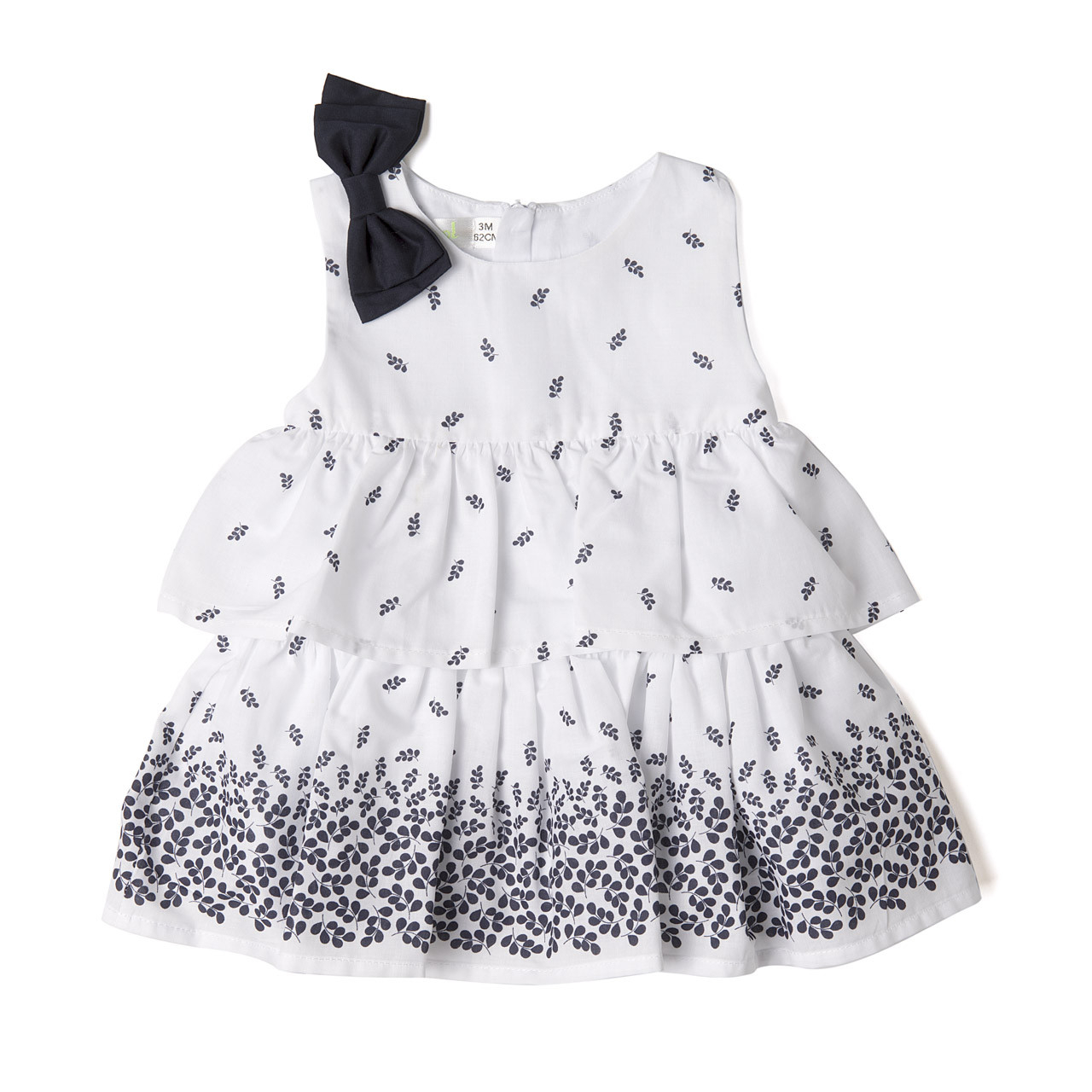 Rochie eleganta din poplin subtire de la Babybol Barcelona, funda aplicata pe umar, doua randuri de volanase, imprimeu frunzulite bleumarin pe toata suprafata, inchidere spate cu fermoar ascuns. 100% bumbac.Made Spania
