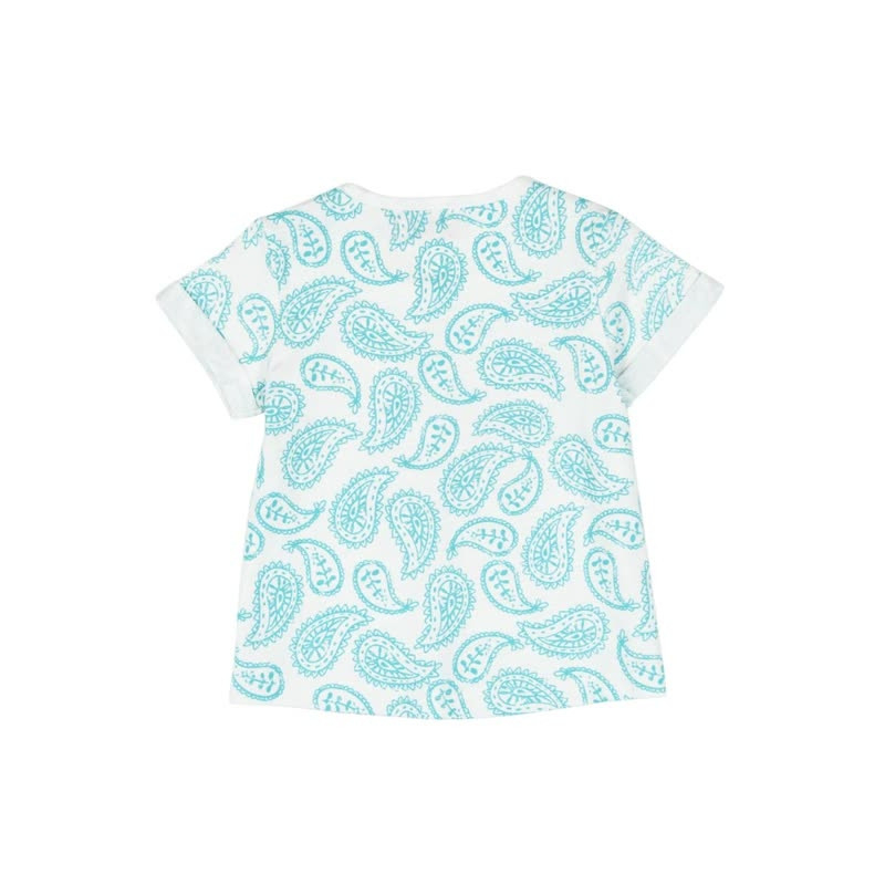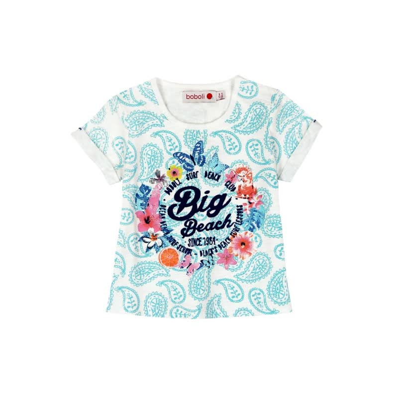 Tricou fete cu maneca scurta de la Boboli, bumbac 100%, culori vesele ,imprimeu grafic pe toata suprafata , marfgine intoarsa la maneca.