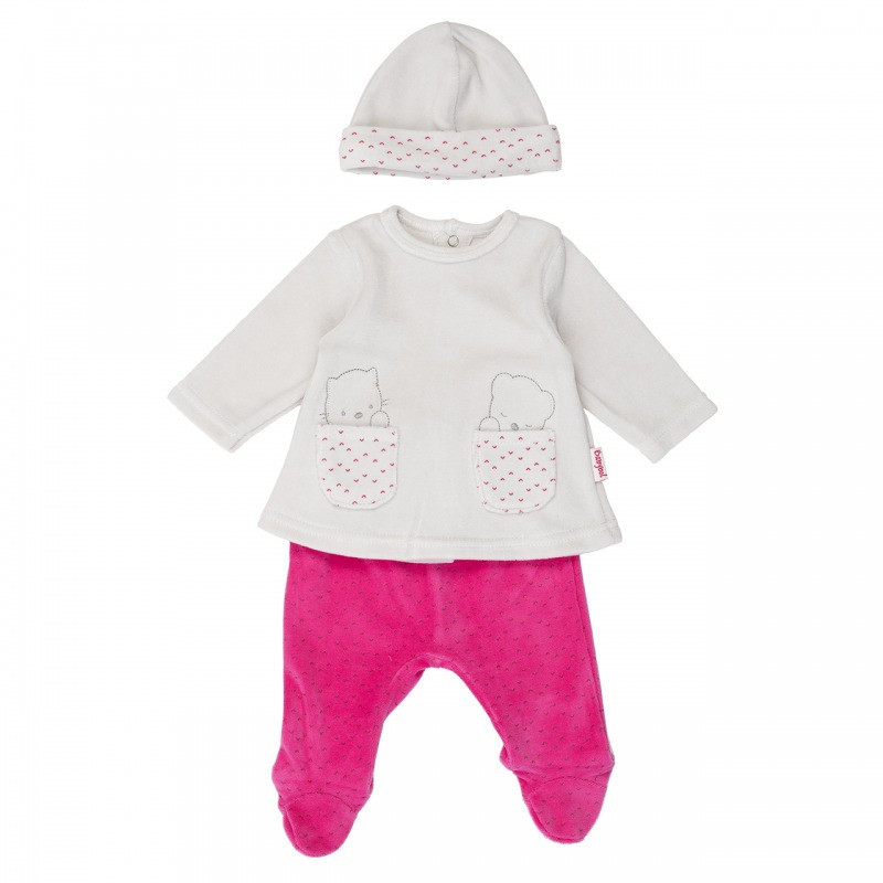 Set dragalas pentru fetite 0-9 luni din bumbac catifelat. Produsul vine ambalat in cutie Babybol.Contine :*bluza cu inchidere pe spate*pantalonas cu botosel , culoare fucsia*caciula Compozitie: 76% bumbac, 24% poliesterMade Spania