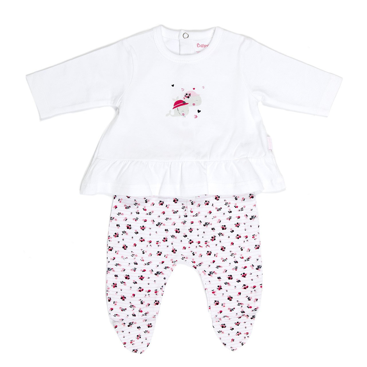 Compleu 2 piese pentru bebe fetita din bumbac, bluza cu maneca lunga cu inchidere pe spate in capse si pantalonas cu botosei, imprimeu floral, elastic in talie. Produsul vine ambalat in cutie Babybol.