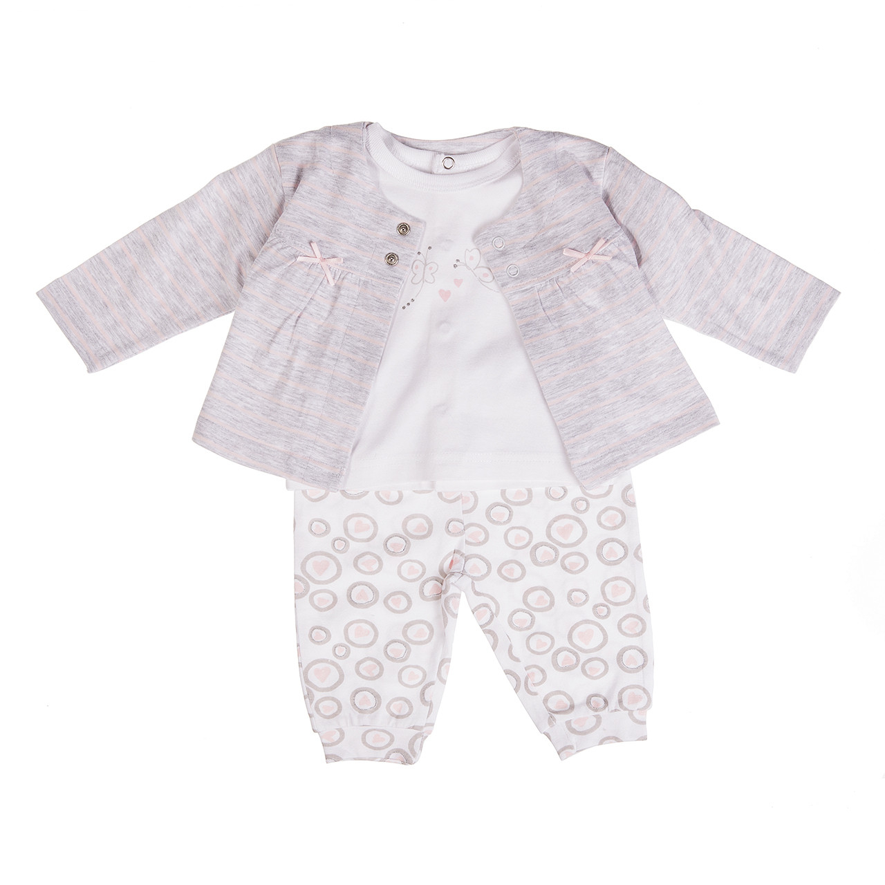 Un costumas pentru fetite perfect pentru zilele de primavara. Confectionat din cel mai bun bumbac, acest costumas este format din cardigan cu maneca lunga , inchidere in 2 capse, fundite aplicate, un tricou cu maneca scurta de culoare alba si un pantalon dragalas cu imprimeu pe toata suprafa cu inimioare roz.