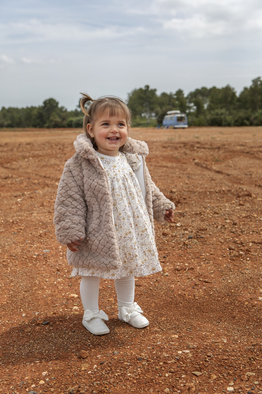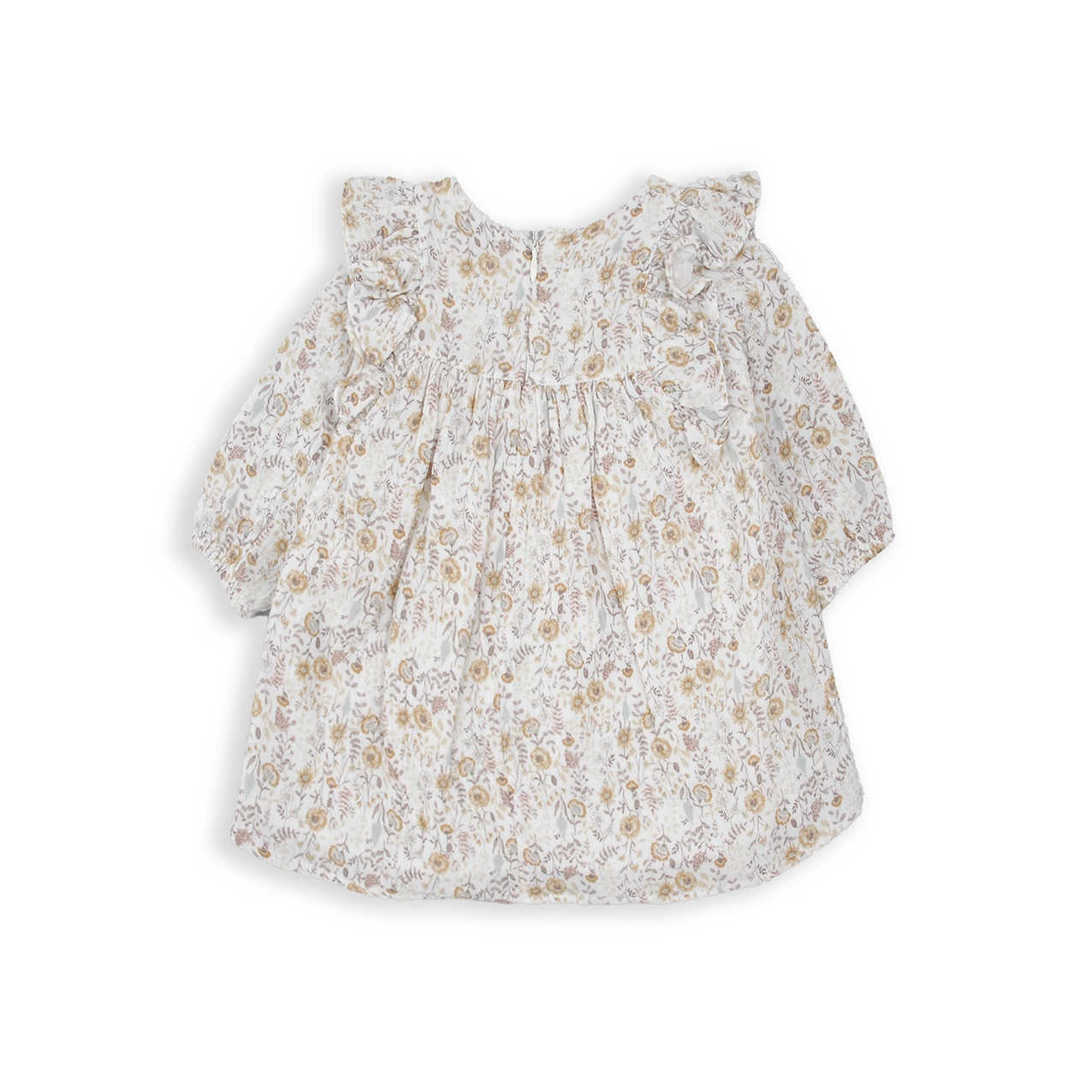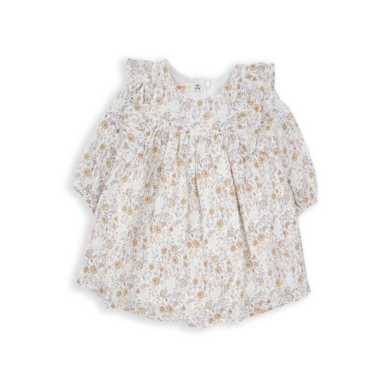 Rochie fete muselina, imprimeu floral, bej, captuseala bumbac, volanase umeri, brand Babybol.