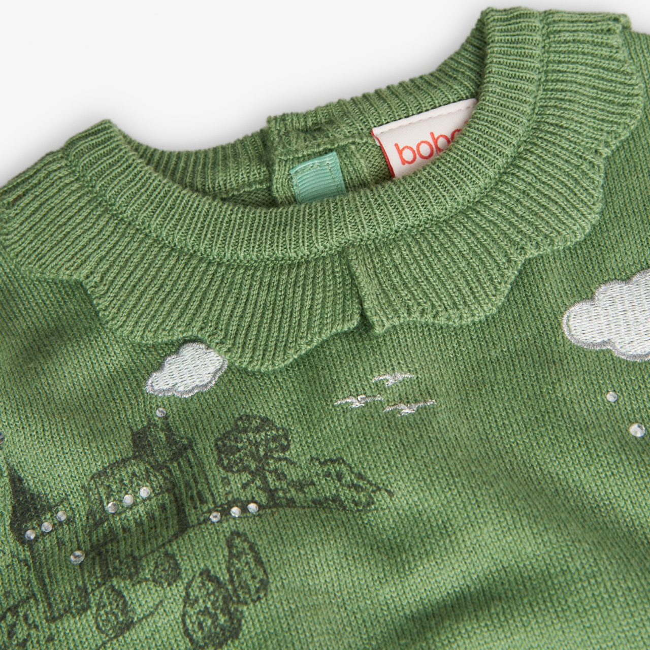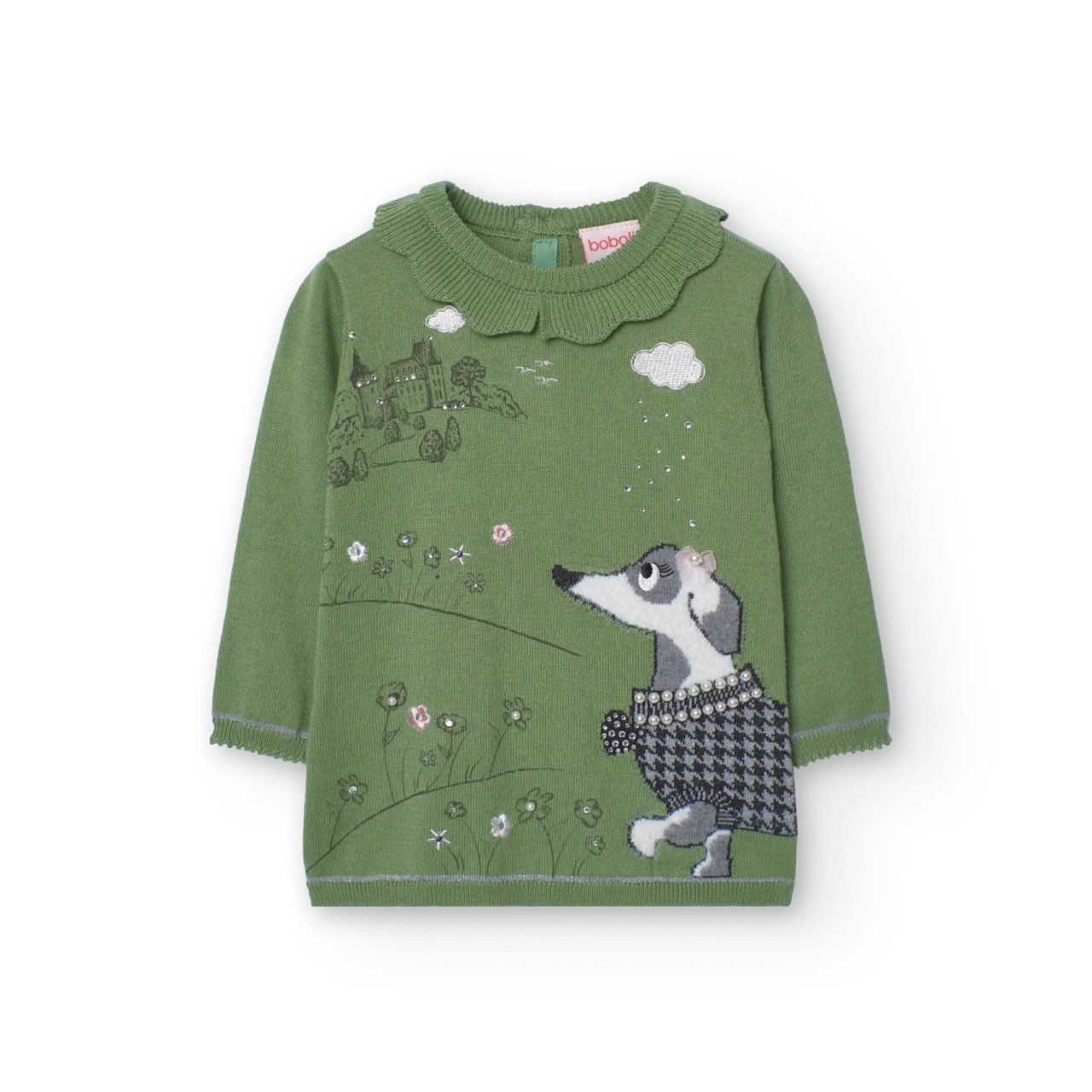 Rochie tricot fin fetite, gama CHIC, imprimeu catel cu perle, verde, brand Boboli