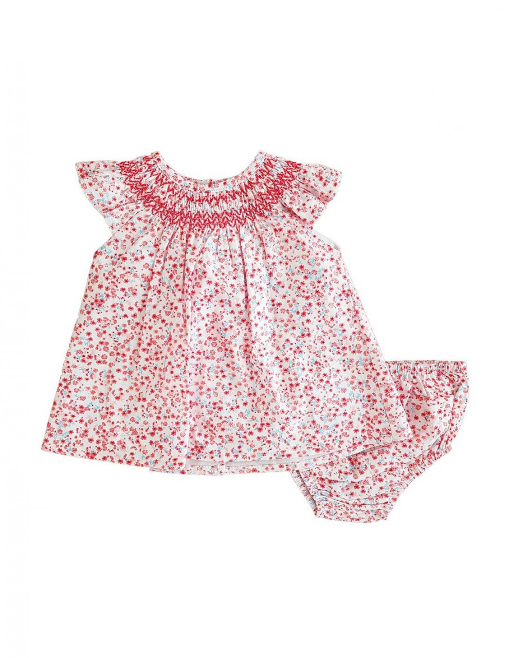 Rochita bebe fetita cu maneca scurta de la Babybol insotita de chilotel in culoare, imprimeu flori rosii, inchidere cu nasturi pe spate.