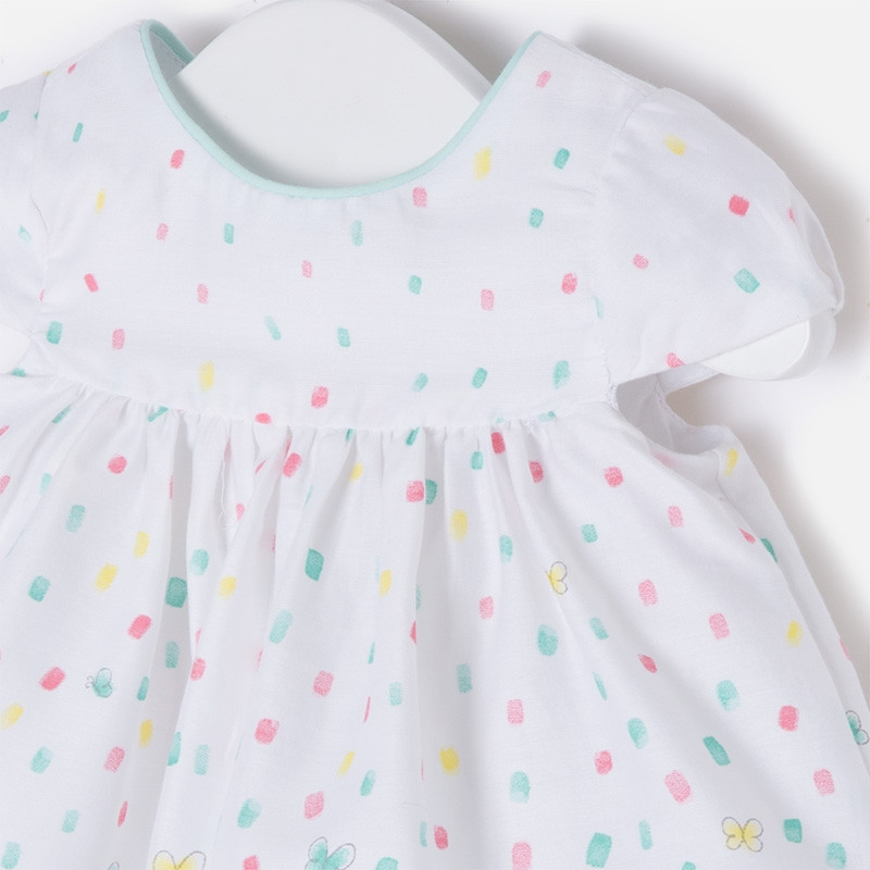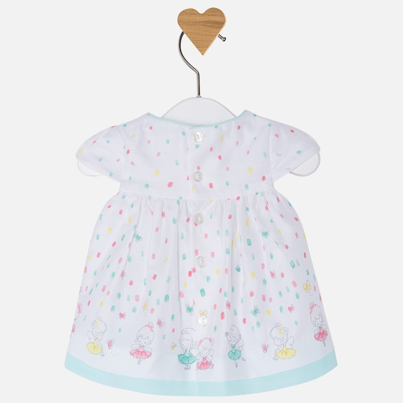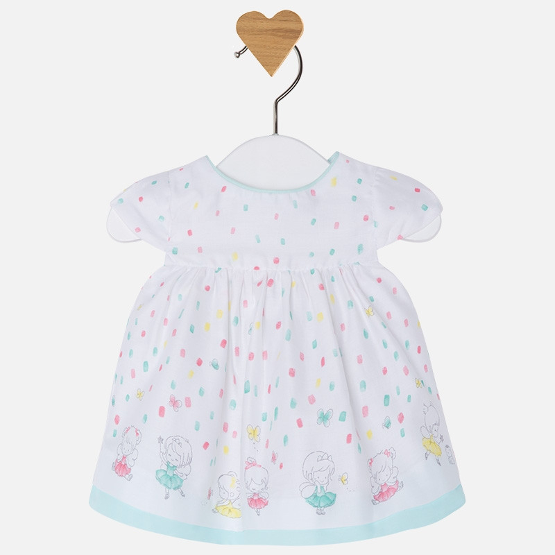 Rochie de vara cu imprimeu  de la Mayoral, din tesatura satinata. Detaliile mici care sunt evidentiate: guler fin si tiv in contrast