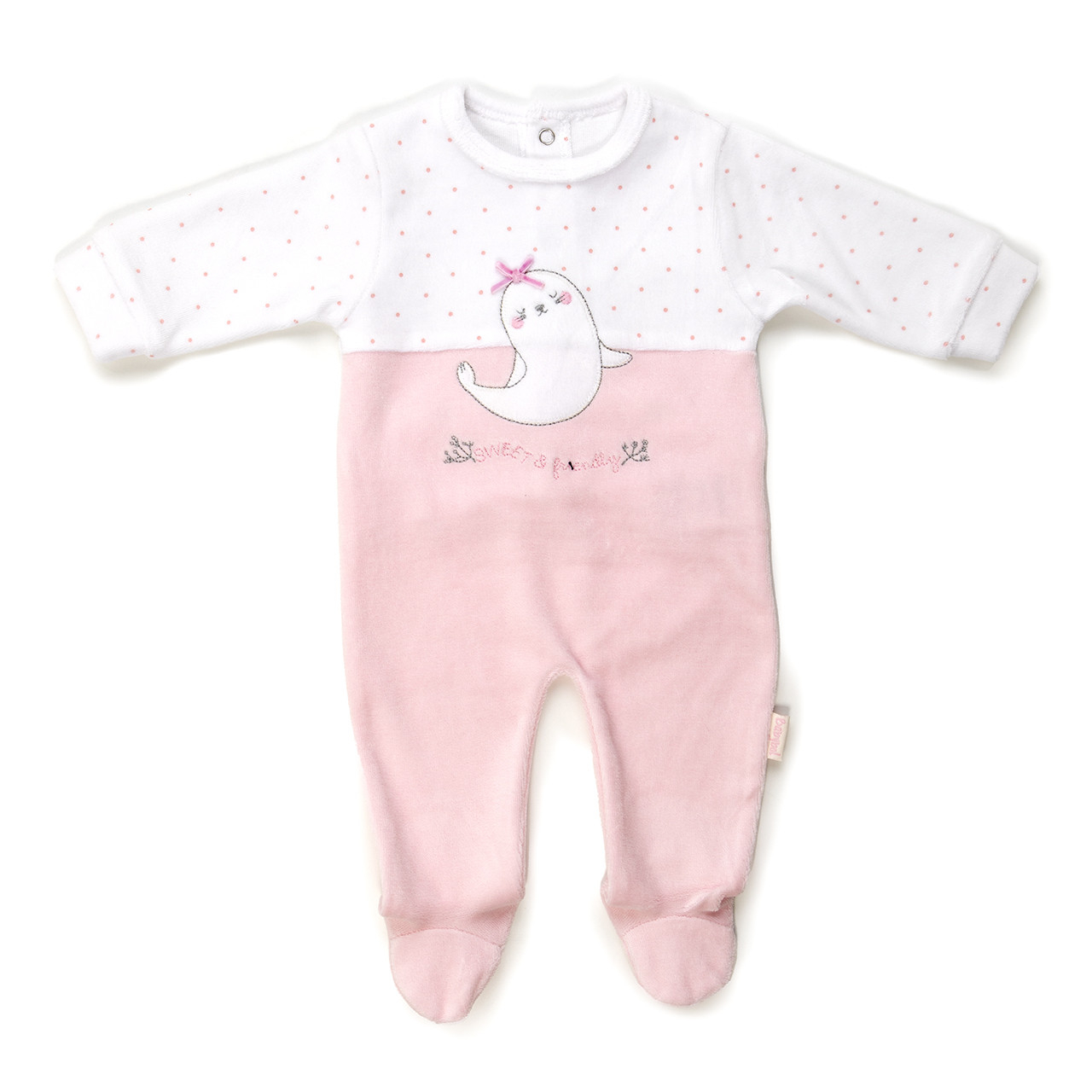 Salopeta bebe fetita din bumbac catifelat cu botosei, contrast de culori, broderie simpatica pe fata, inchidere pe spate cu capse.