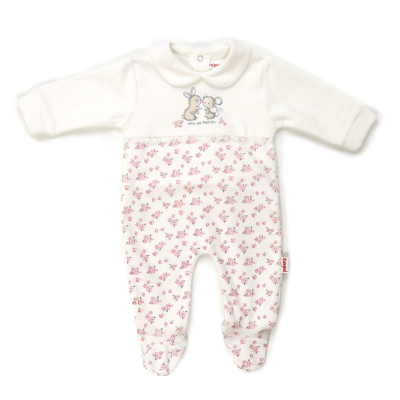 Salopeta din bumbac catifelat cu maneca lunga si botosei pentru bebe fetita , imprimeu soricel si flori , guler rotund, inchidere pe spate cu capse. Produsul vine ambalat in cutie Babybol.