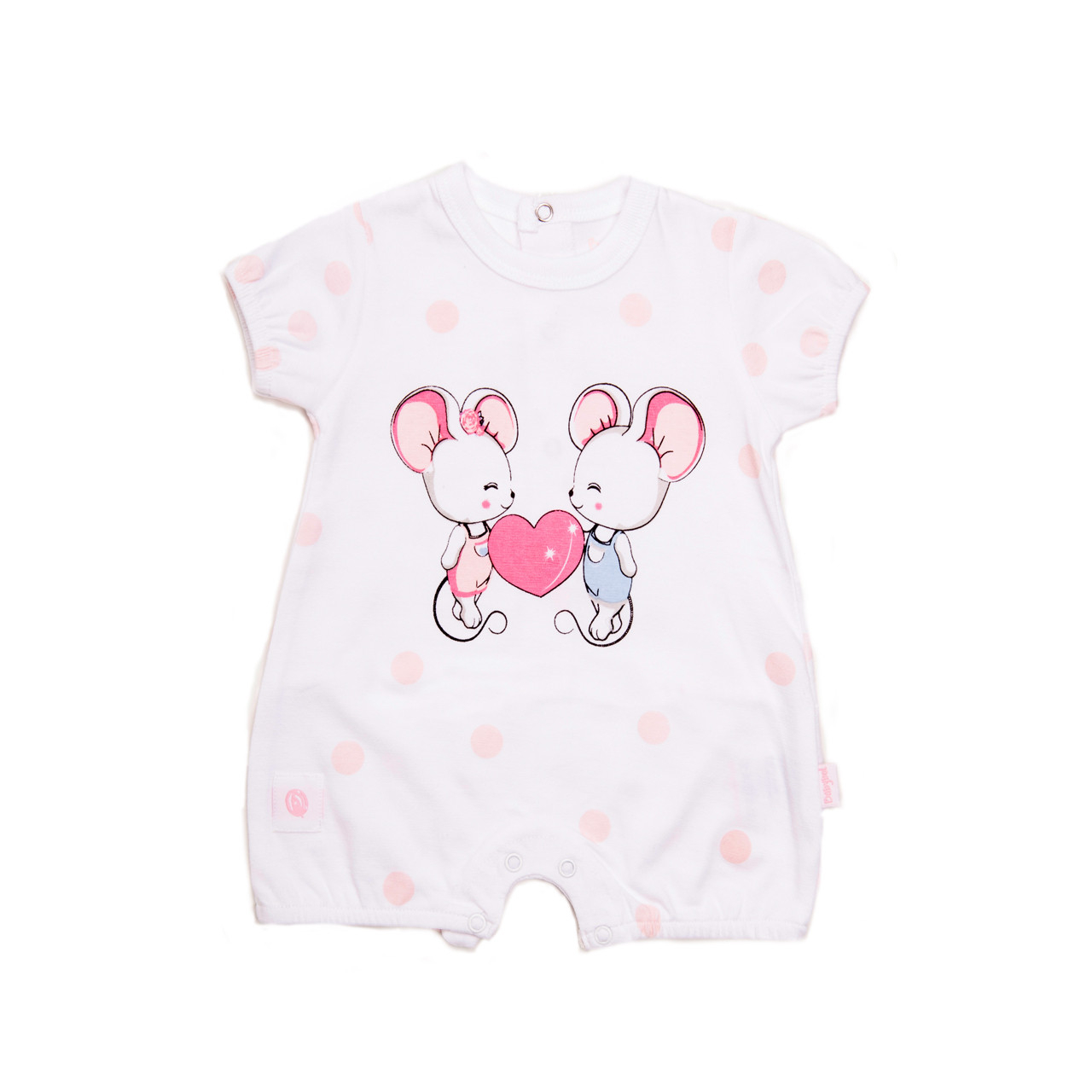 Salopeta vara bebelusi,imprimeu soricei, buline roz, inchidere spate si intre picioare, bumbac 100%.