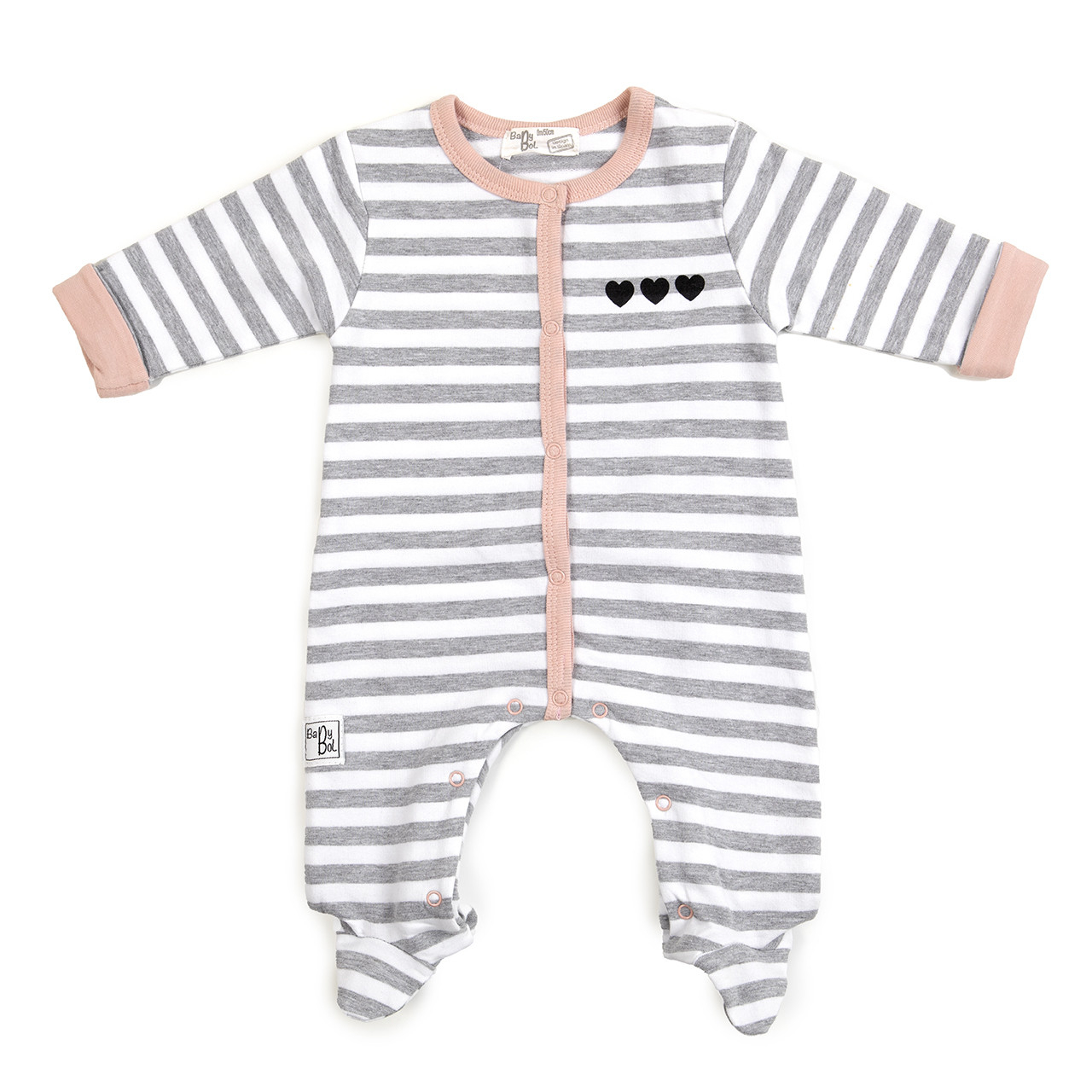 Salopeta bumbac cu botosei pentru fetita , dungi gri, deschidere pe fata cu capse si intre picioare.