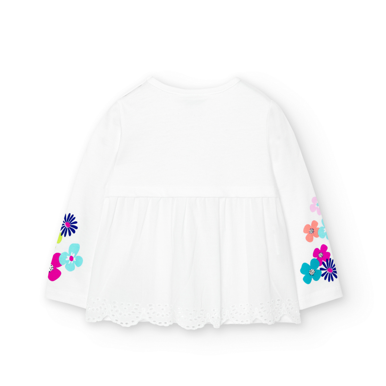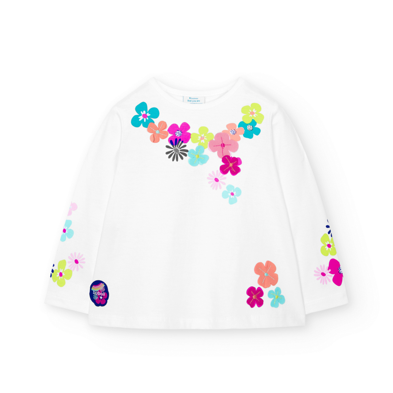 Tricou maneca lunga fete, imprimeu si aplicatii florale, bumbac better cotton, alb, Boboli.