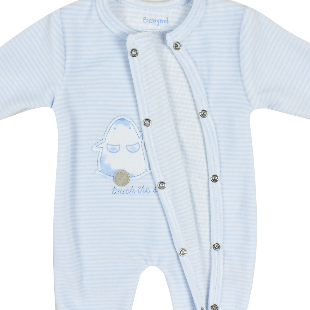 Salopeta bebe baiat cu maneca lunga si botosei din material catifelat. Deschiderea pe fata cu capse faciliteaza o imbracare usoara.