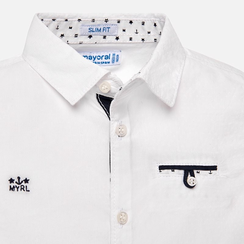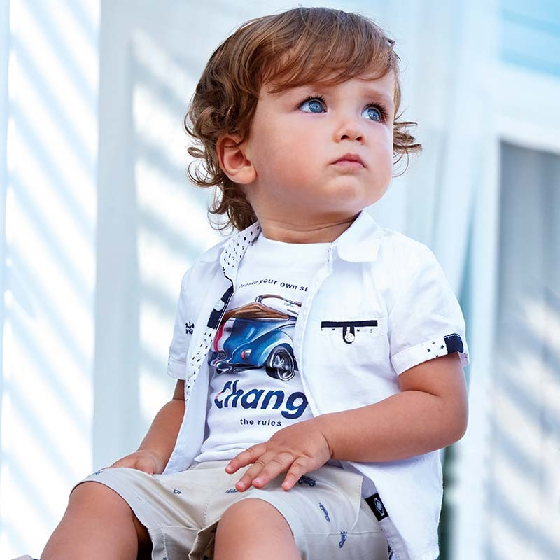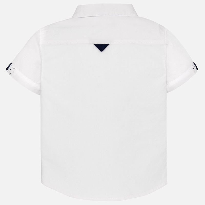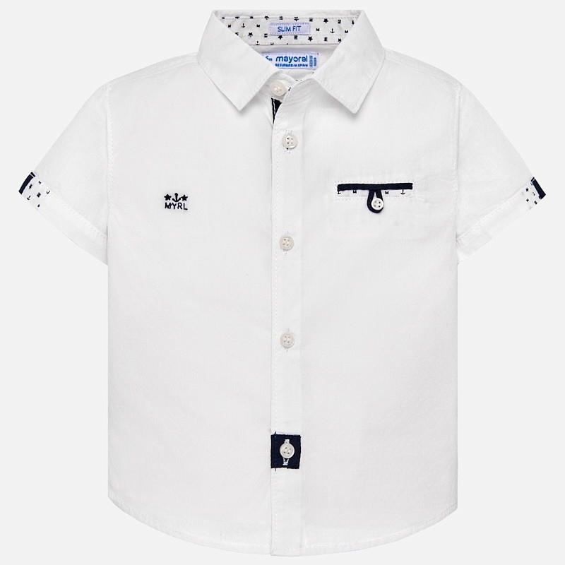 Camasa cu maneca scurta pentru bebe baiat de la Mayoral. Guler camasa. Inchidere cu nasturi pe partea frontala. Material 100% bumbac. Buzunar functional pe partea frontala. Elemente decorative: broderie. Design neted.