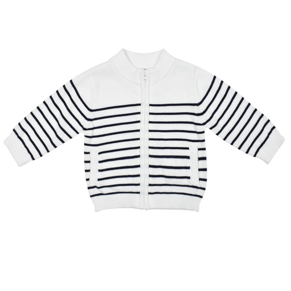 Jacheta baiat din bumbac tricotat de la Babybol, dungi bleumarin , inchidere usoara cu fermoar, buzunare laterale.