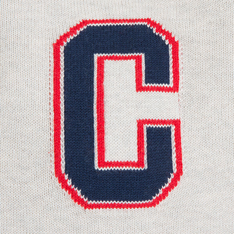 Pulover pentru bebe baiat, material moale confortabil, amestec de bumbac cu poliamida si lana, nasturei pe umar pentru o imbracare usoara, litera C tricotata pe fata.