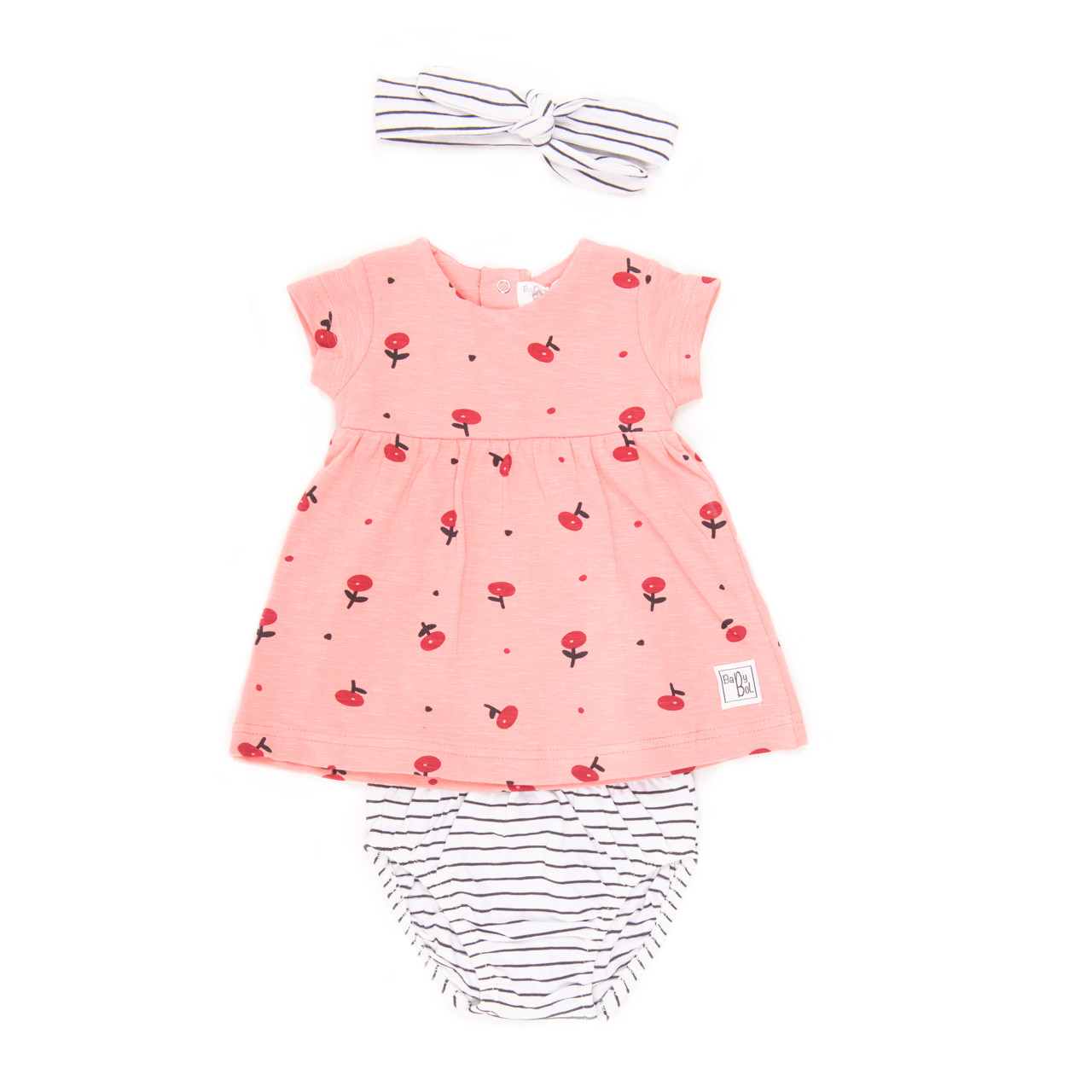 Rochita casual cu maneca scurta pentru bebeluse din bumbac moale insotita de un chilotel si bandana alba cu dungi navy.
