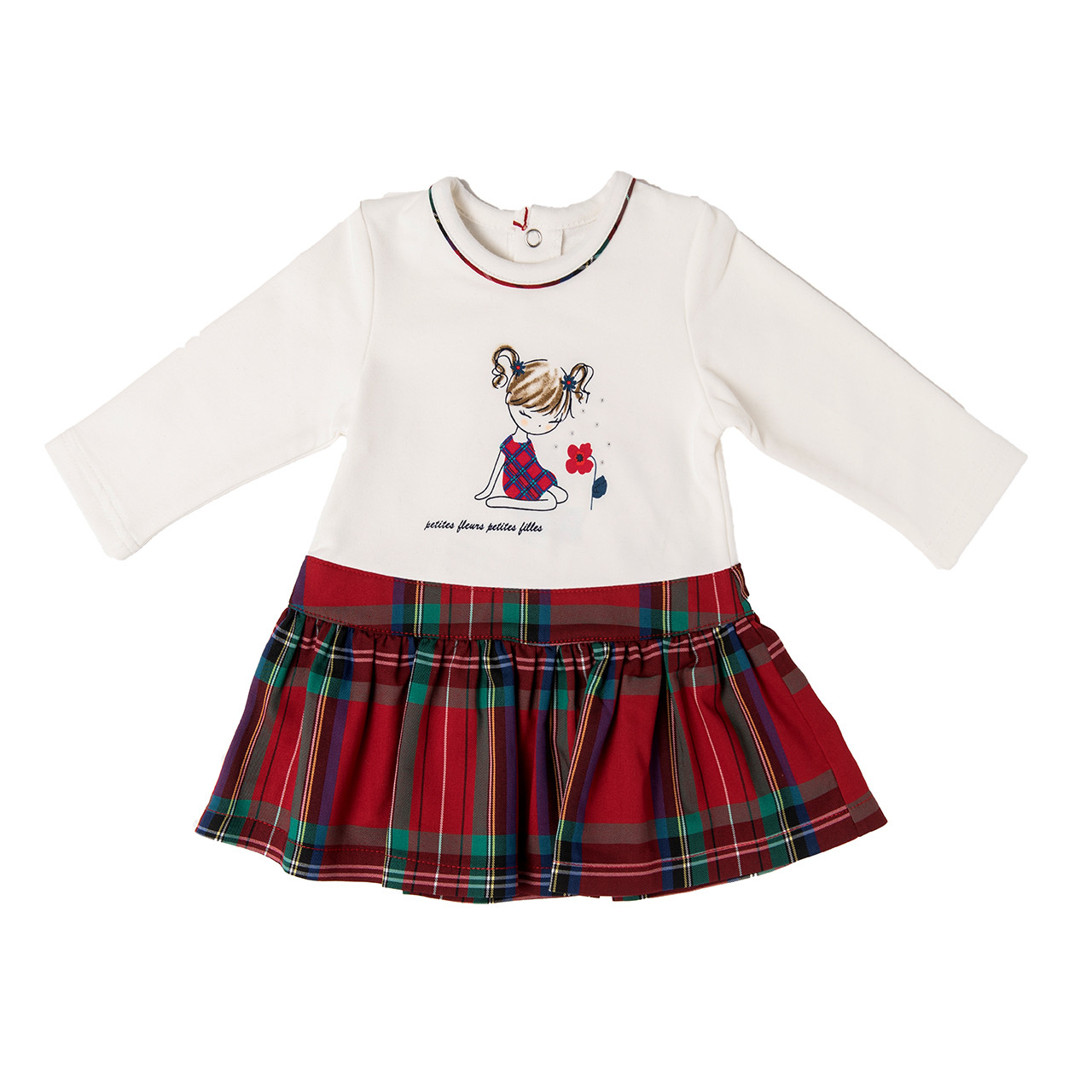 Rochie Babybol cu maneca lunga cu fusta ecosez rosie, imprimeu fetita pe piept , partea superioara este jersey moale , inchiderea se face cu capse pe spate.Un cadou ideal de Craciun.Made Spania