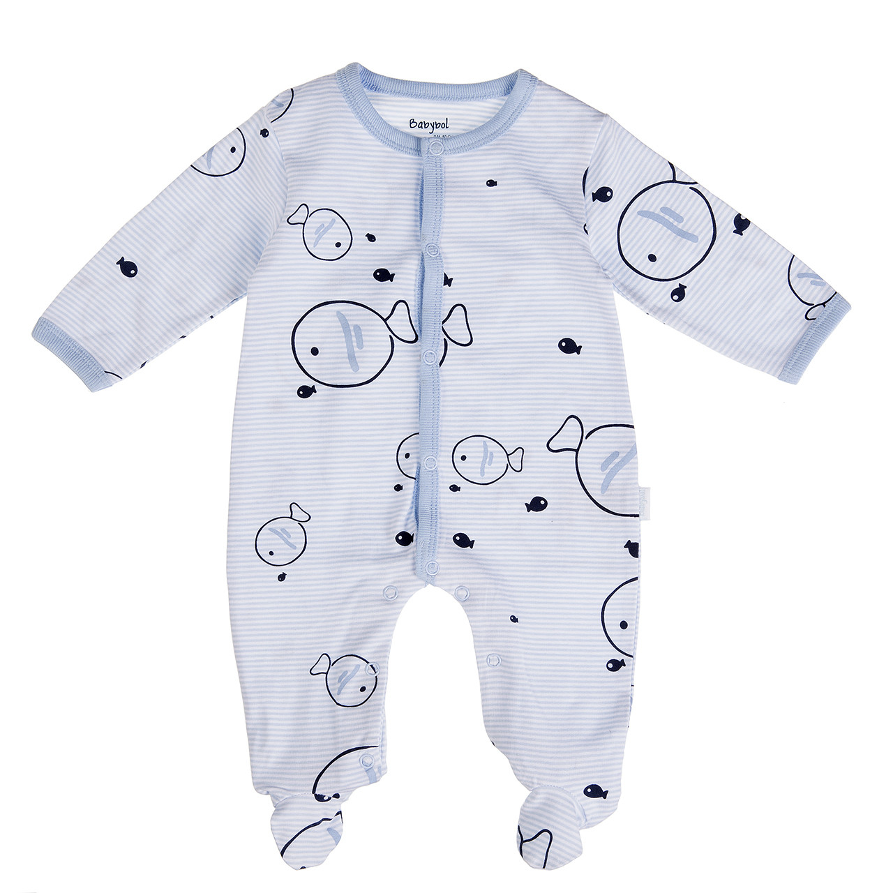 Salopeta bebe baiat cu maneca lunga si botosei, bumbac subtire,imprimeu pestisori, dungi blue,inchidere pe fata cu capse. Produsul vine ambalat in cutie Babybol.