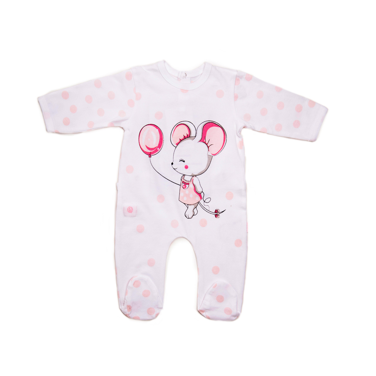 Salopeta bebe fetita din bumbac soft cu maneca lunga si botosei de la Babybol, inchidere spate, un imprimeu soricel cu balon si bulinute roz decoreaza salopeta, inchidere pe spate si intre picioare pentru un schimb rapid al pampersului fara a dezbraca copilul integral.