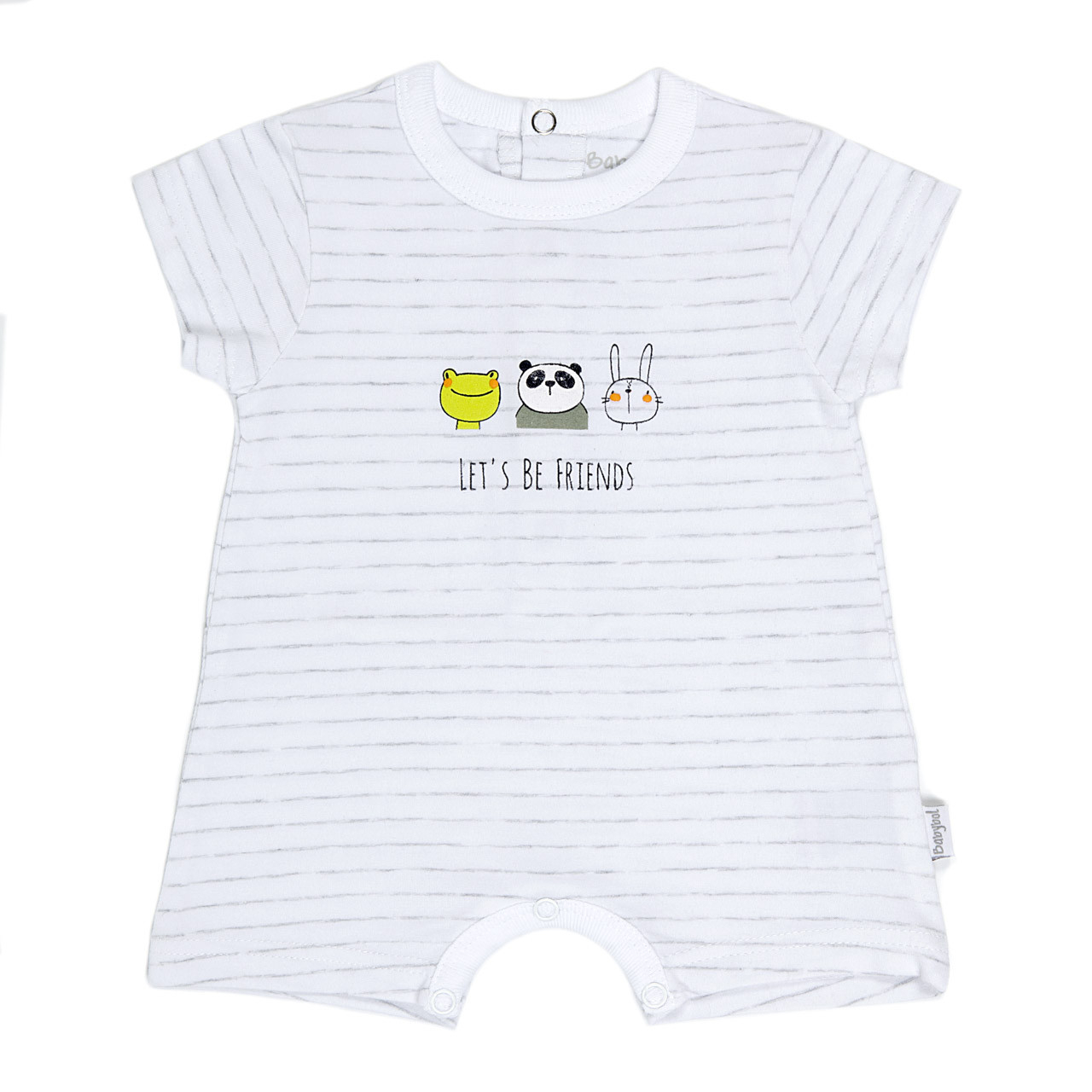 Salopeta cu maneca scurta Babybol pentru baiat 0-12 luni din bumbac, inchidere pe spate si intre picioare cu capse, dungi gri, print pe fata.