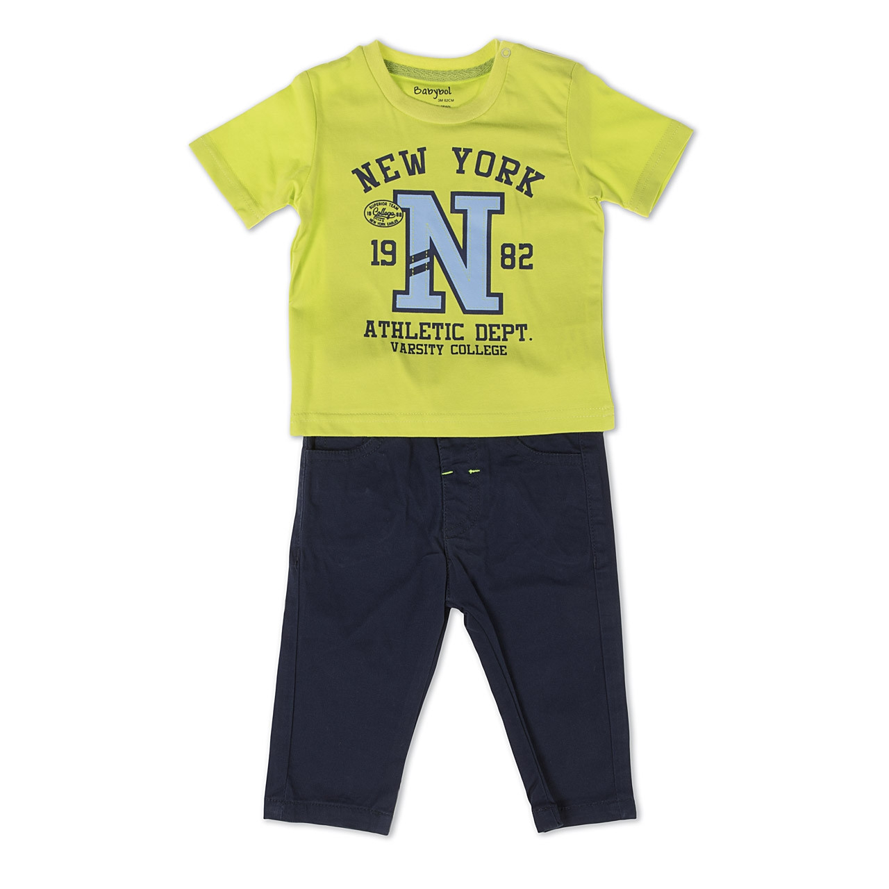 Set doua piese baiat , brand Babybol format din tricou maneca scurta de culoare verde, materialul este bumbac 100% de foarte buna calitate, imprimeu pe fata, guler rotund si pantaloni lungi din material catifelat 100% bumbac,reglabil in talie.