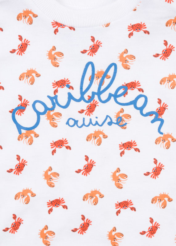 Set bebe baiat de la Losan, format din salopeta denim strech cu inchidere intre picioare cu capse, buzunar frontal si tricou maneca scurta, imprimeu raci.