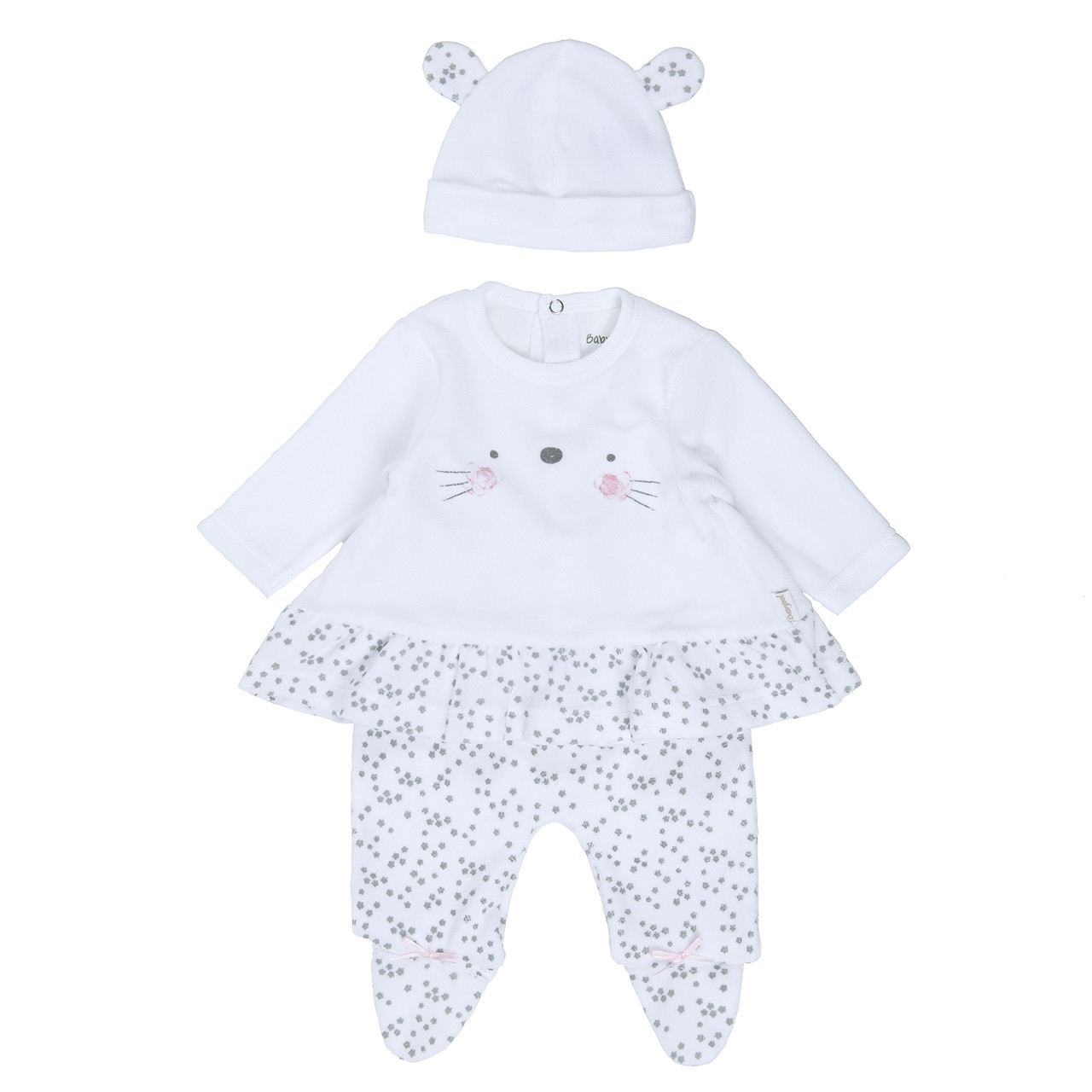 Un superb set ambalat in cutie cadou pentru bebeluse din catifea fina, cu imprimeu vesel. Setul e format din bluzita cu maneca lunga, volanas pe margine si inchidere pe spate cu capse , pantalon cu botosel si caciulita ornata cu 2 urechiuse simpatice.
