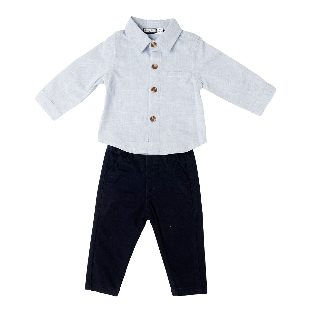 Set elegant din 2 piese pentru baiat, compus din camasa maneca lunga din bumbac, inchidere cu nasturi si pantalon din bumbac , material putin elastic, moale placut la atingere, reglabil in talie.