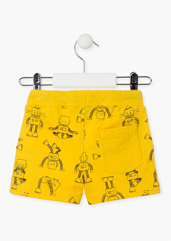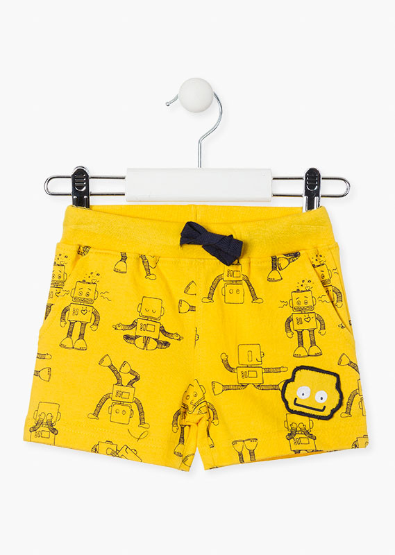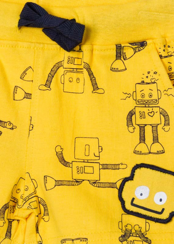 Sort bumbac bebe baiat, imprimeu roboti, galben, buzunare laterale si spate, siret in talie. Brand Losan