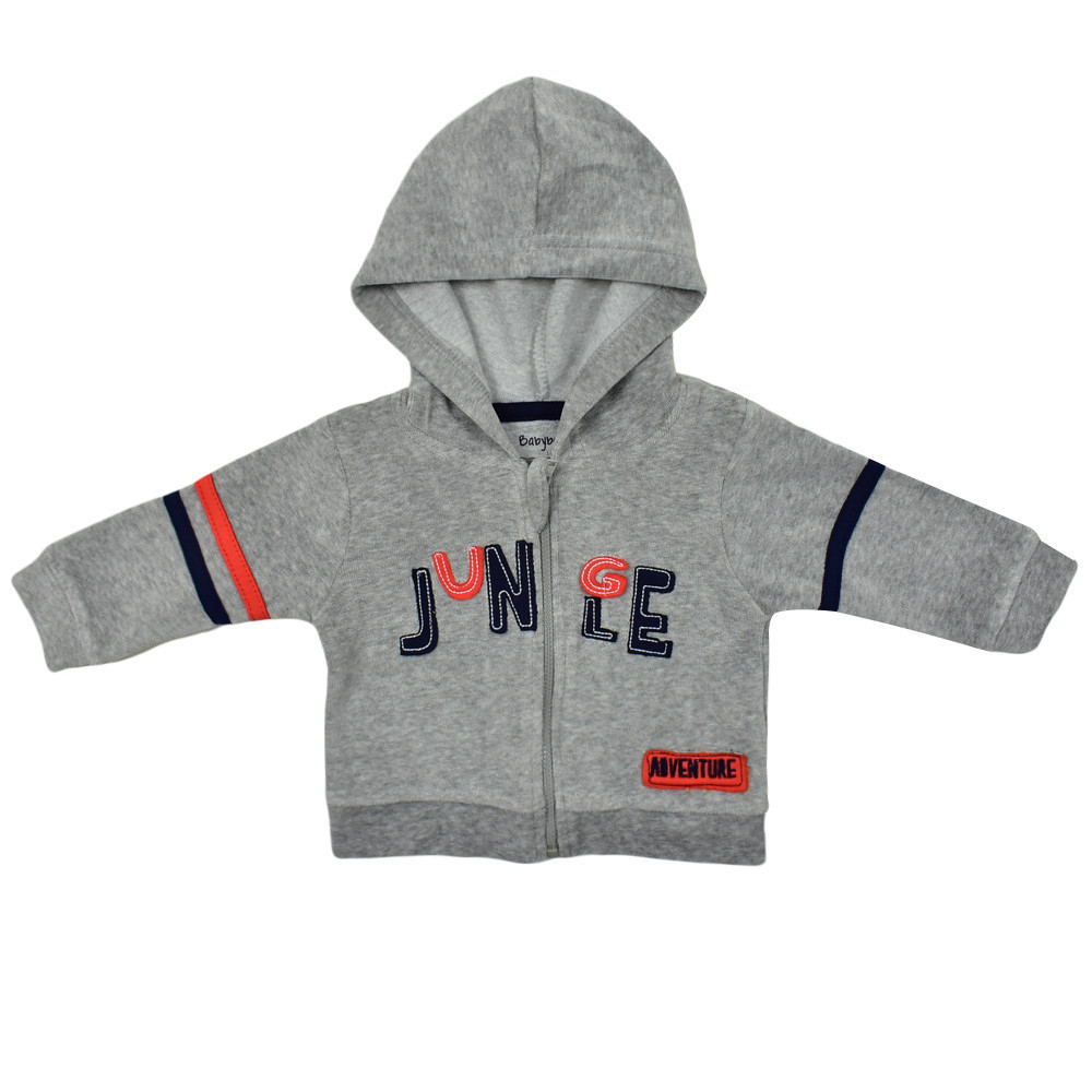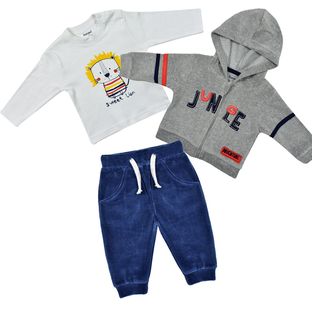 Trening pentru bebe baieti din catifea de la Babybol. Contine jacheta cu gluga , tricou cu maneca lunga si pantalon din catifea.