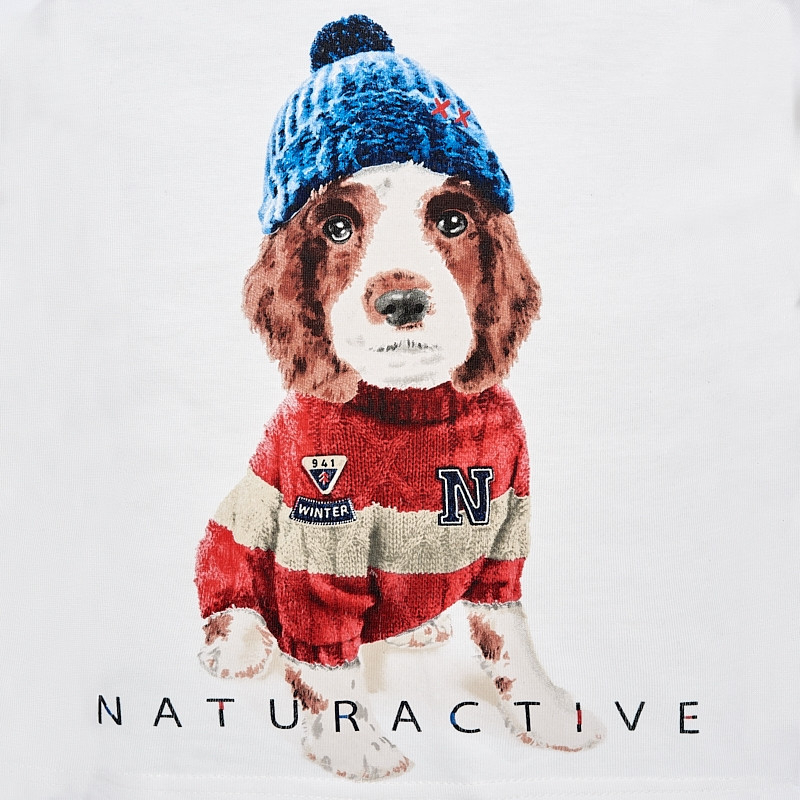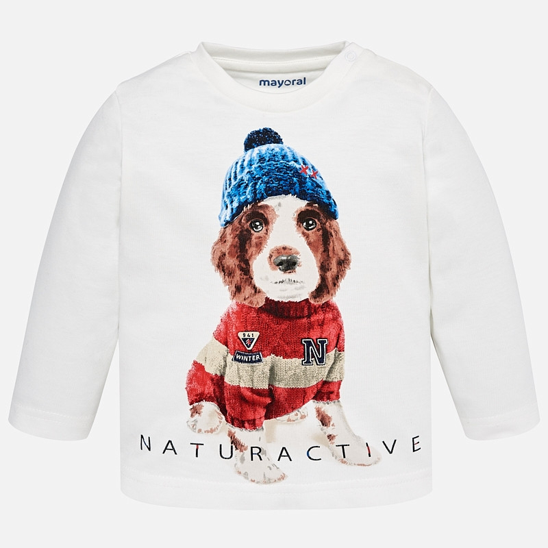 Tricou cu maneca lunga de la Mayoral pentru baieti, 100% bumbac, cu imprimeu catel, inchidere cu 2 capse pe umar pentru a facilita imbracarea.