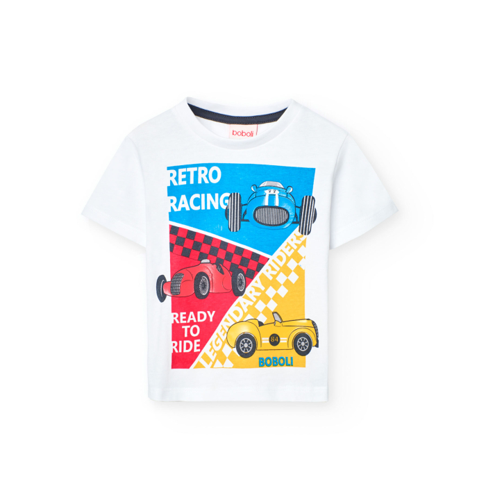Tricou maneca scurta baiat 1-8 ani, bumbac better cotton, imprimeu racing car gumate, alb, brand Boboli