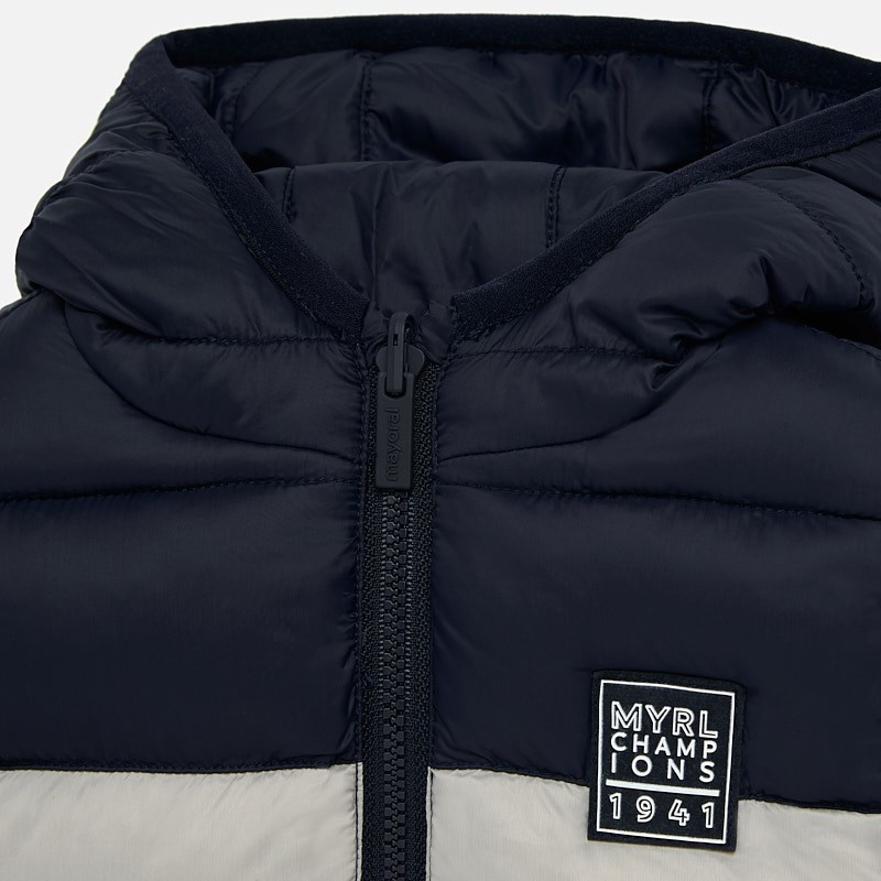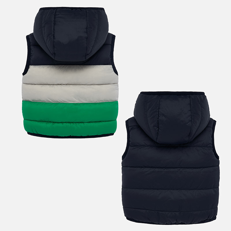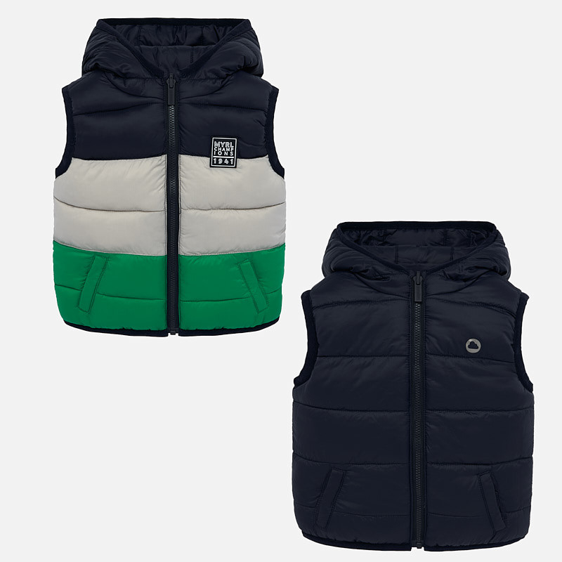 Vesta pentru bebe baiat Mayoral. Guler rotund. Model cu gluga. Inchidere centrala cu fermoar. Design matlasat cu vata. Buzunare functionale pe partea frontala. Acest model prezinta un design reversibil.