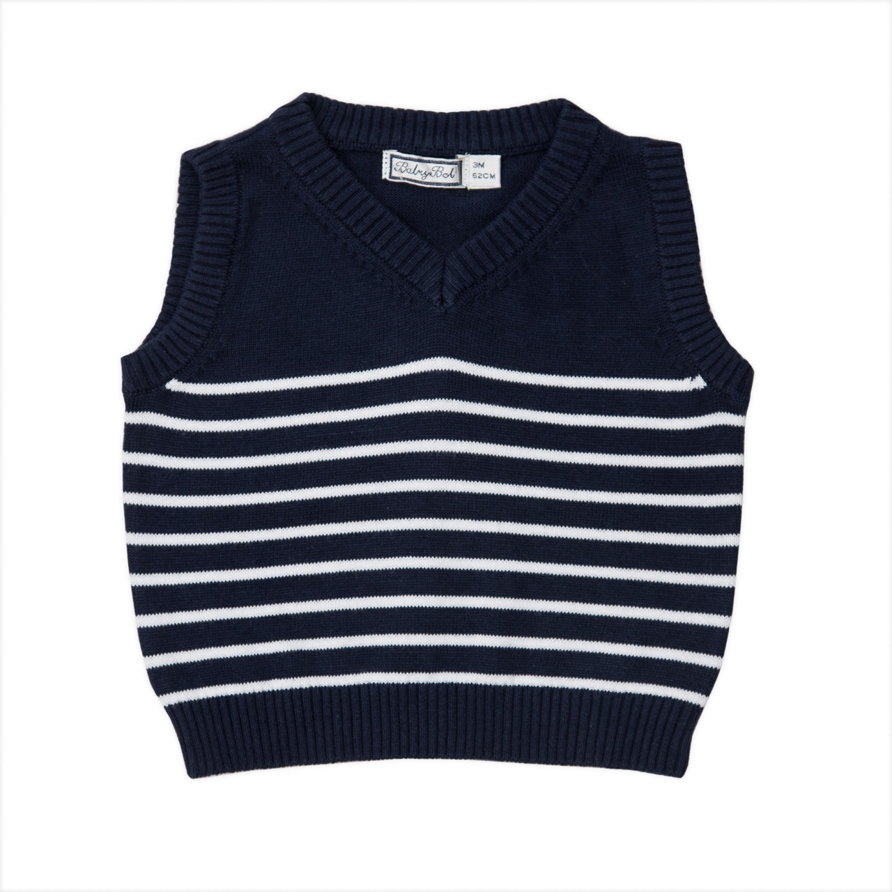 Vesta tricot baiat de la Babybol bleumarin cu dungi albe, guler in V, 100% bumbacMade Spania