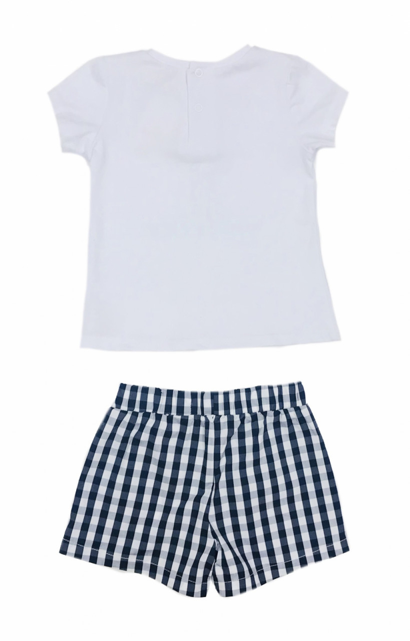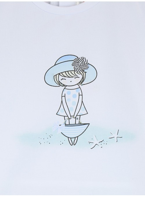 Delicat ! Acest set de vara pentru fetite trebuie sa faca parte din garderoba fetitei. Acest set contine :*tricou cu maneca scurta din bumbac, imprimeu fetita*pantalon scurt cu volanase pe laterala*bandana Made Spania