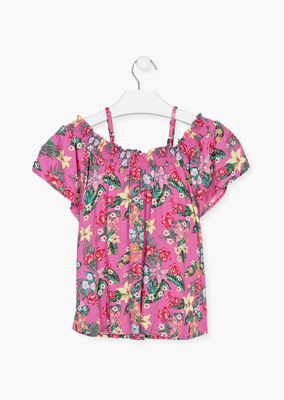 Bluza fete 8-16 ani cu imprimeu floral, model cazut pe umeri cu bretelute subtiri , material vaporos , 100% vascoza.Brand LosanMade Spania