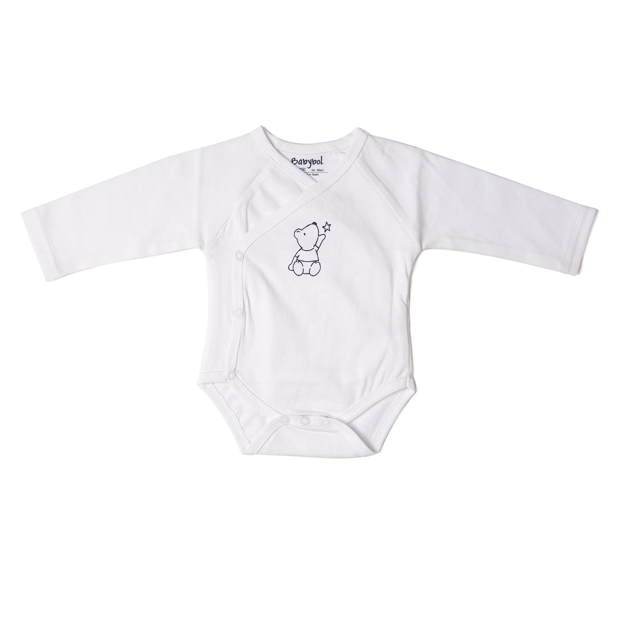 Body bebe cu maneca lunga din bumbac organic de la Babybol,imprimeu delicat, alb. Este foarte practic deoarece se deschide si închide cu capse intr-o parte si intre picioare în dreptul scutecului.Material antialergenic fara coloranti si neprelucrat sintetic, bumbac extra moale,fara elastan, efect respiratie a pielii si termoregulator, absorbant din bumbac organic , acesta nu contine reziduuri de pesticide, insecticide sau alte chimicale si este colorat cu pigmenti non-toxici. De asemenea, capsele nu contin nichel.