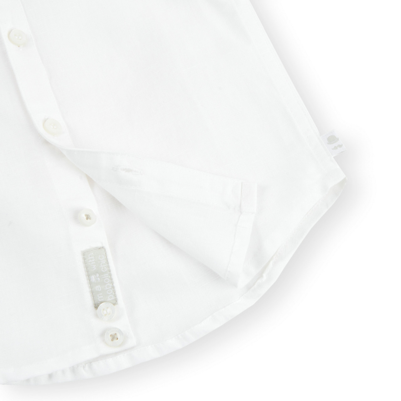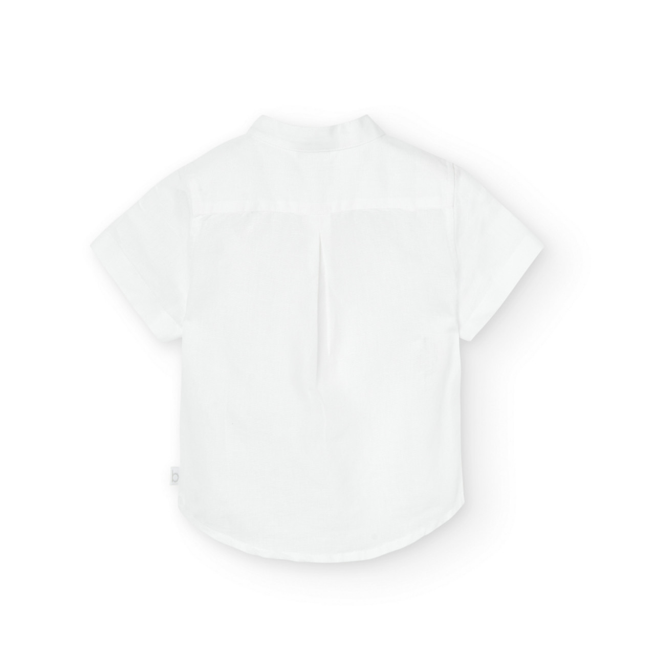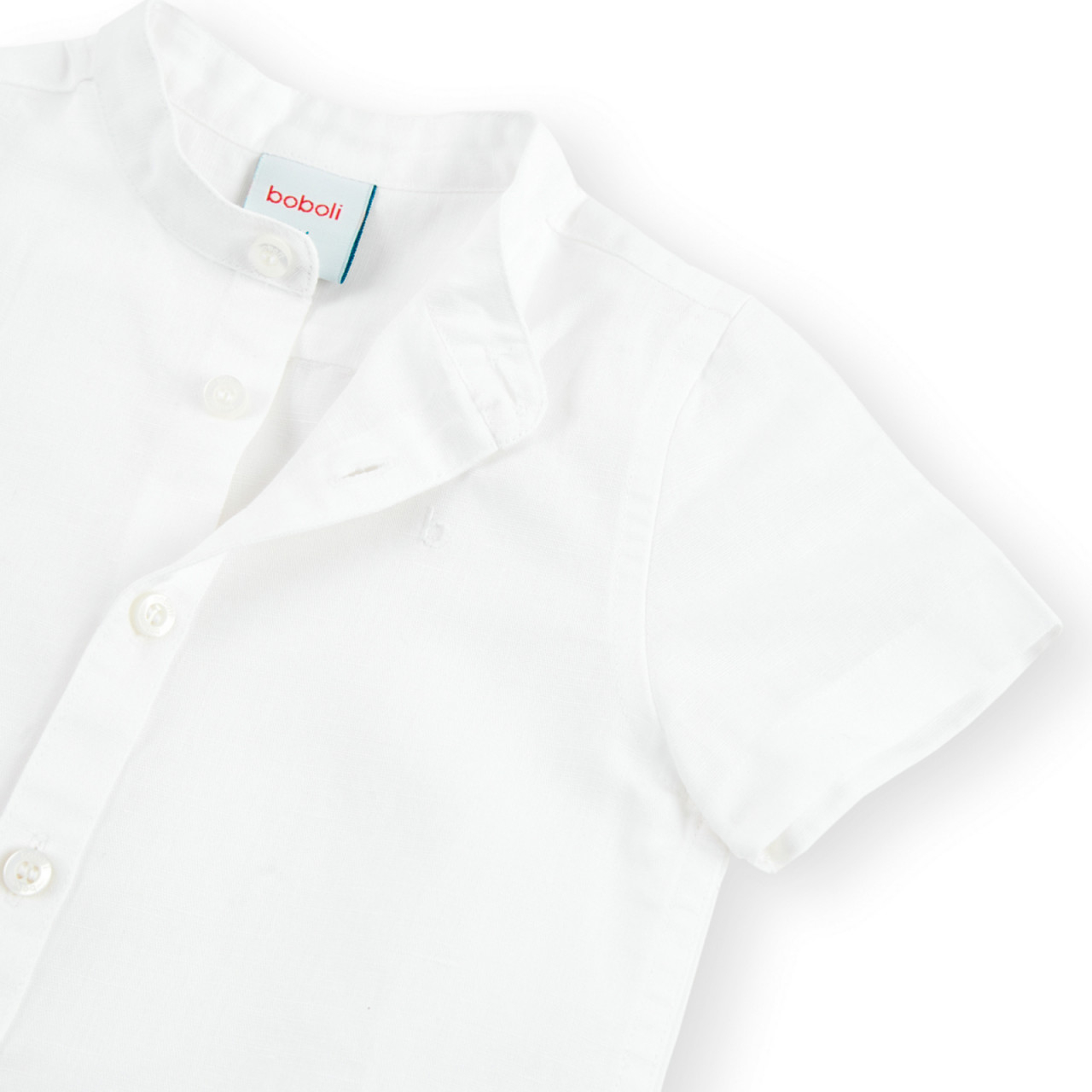 Camasa baiat cu mâneca scurta din in alb Boboli. Gulerul este mao. Se încheie cu nasturi în fata.