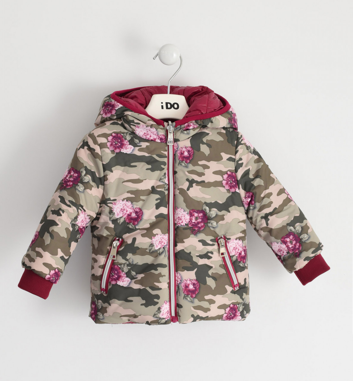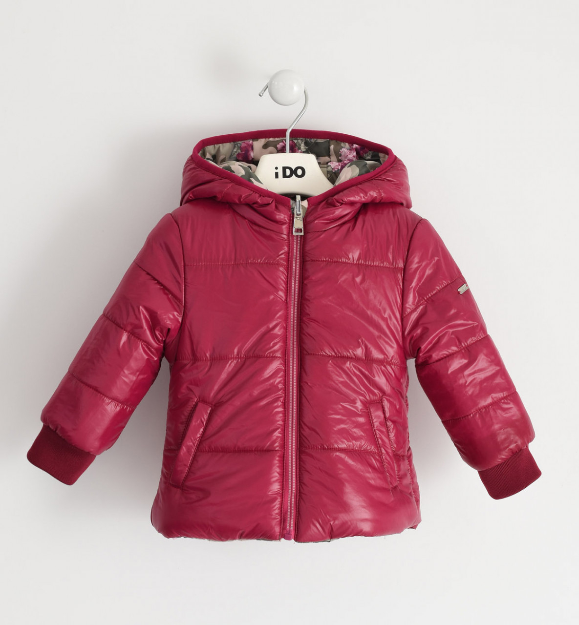 Geaca fete reversibila, proprietati thermice, imprimeu floral pe o fata si culoare uni grena pe cealalta fata, gluga nedetasabila, buzunare laterale cu fermoar, o geaca foarte usoara si calduroasa care nu pune presiune pe umerii copilului tau.