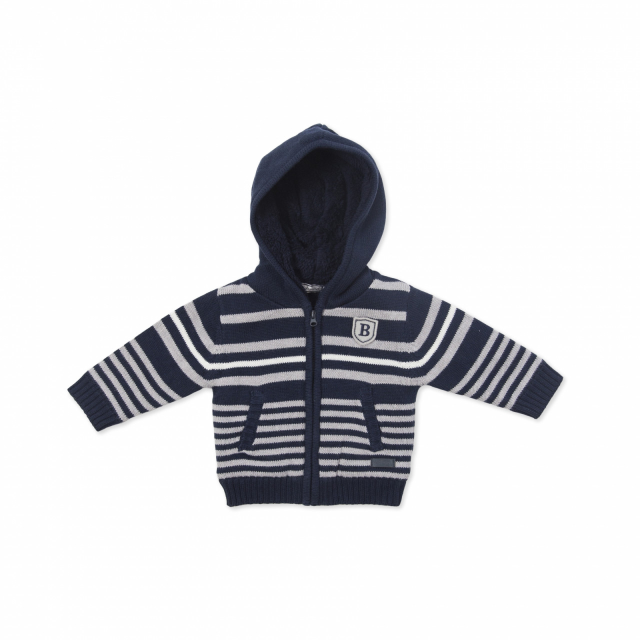 Jacheta  tricotata din bumbac baieti ,  cu gluga,, interior  blanita  acril, inchidere  fermoar  , buzunare  pe  fata . Pe  piept  are aplicatie gri cu albastru .