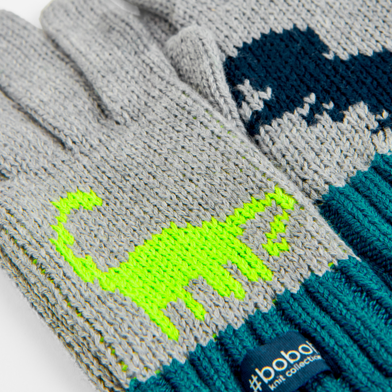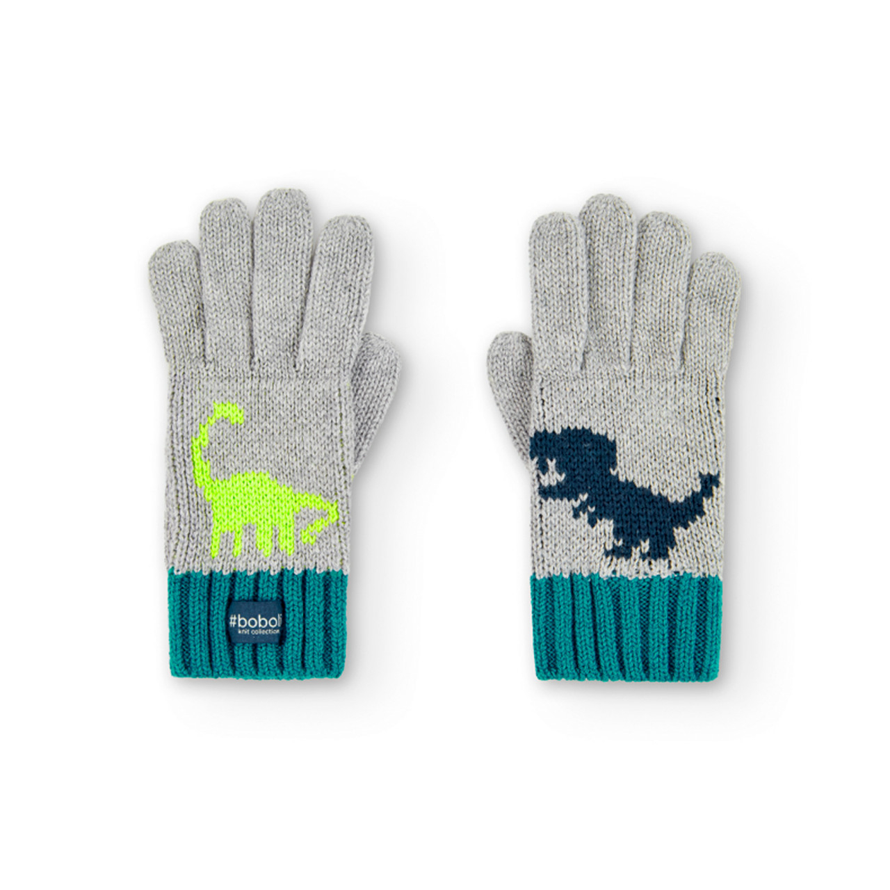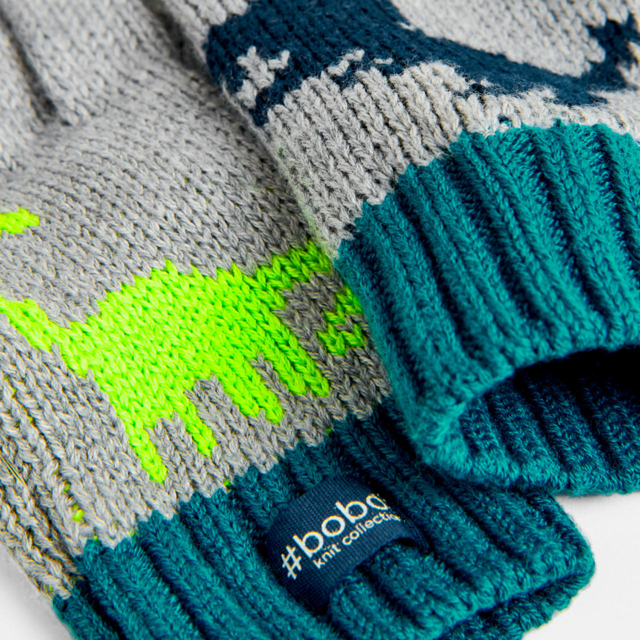 Manusi tricot cu degete baieti, imprimeu dinozauri, margine elastica verde.