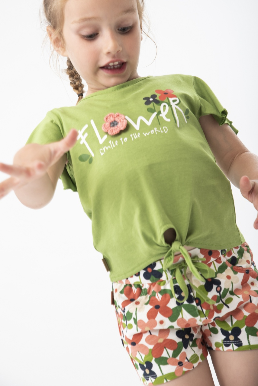 Pantaloni scurti fete, bumbac better cotton, imprimeu floral, kaki, buzunare laterale, banda elastica si siret in talie, brand Boboli.