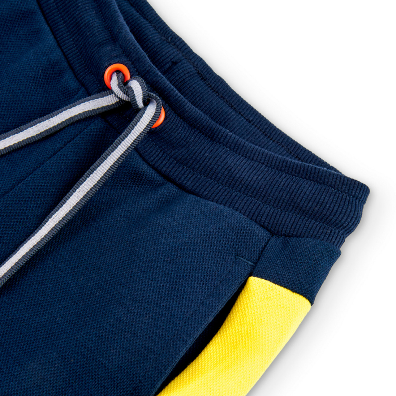Pantaloni trening baiat din bumbac mercerizat, banda elastica in talie si siret, bleumarin cu banda galbena pe lateral.Marca BoboliCompozitie 100% bumbacCertificare Oeko Tex si AmforiMade Spania