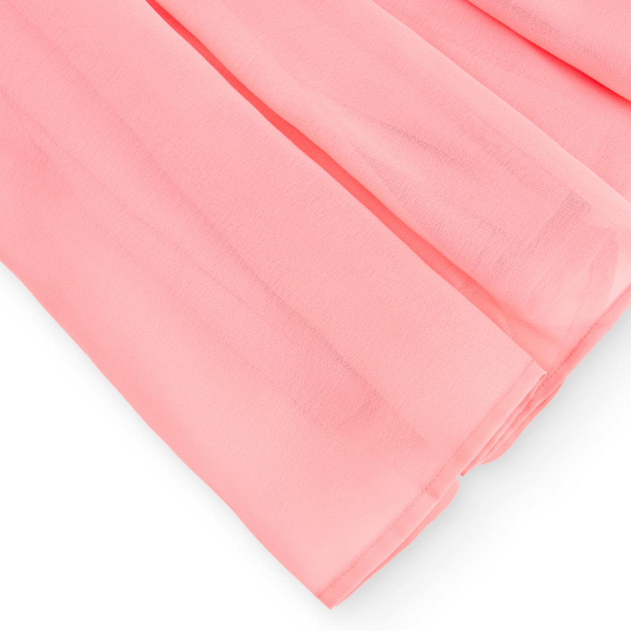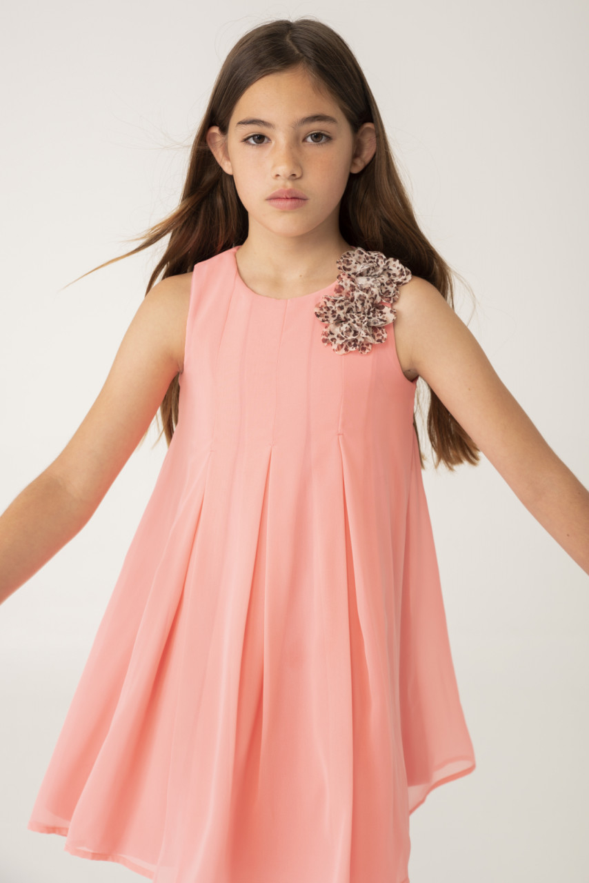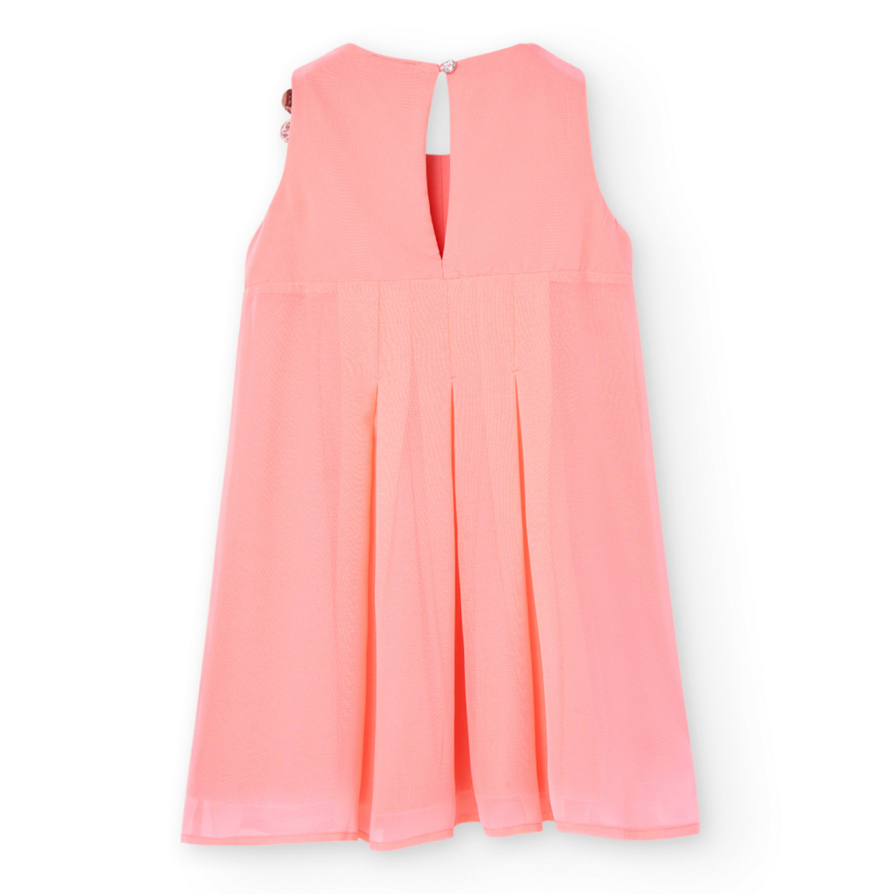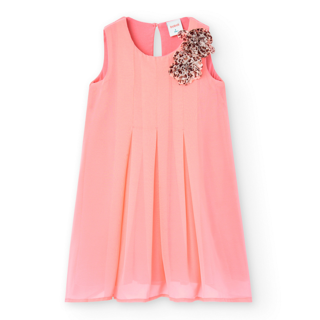 Rochie fara maneci pentru fetite din chiffon vaporos, marca Boboli, flori din voal animal print aplicate la umar, inchidere cu un nasture ornamental pe spate, pliuri ample. Rochia face parte din colectia CHIC Boboli.