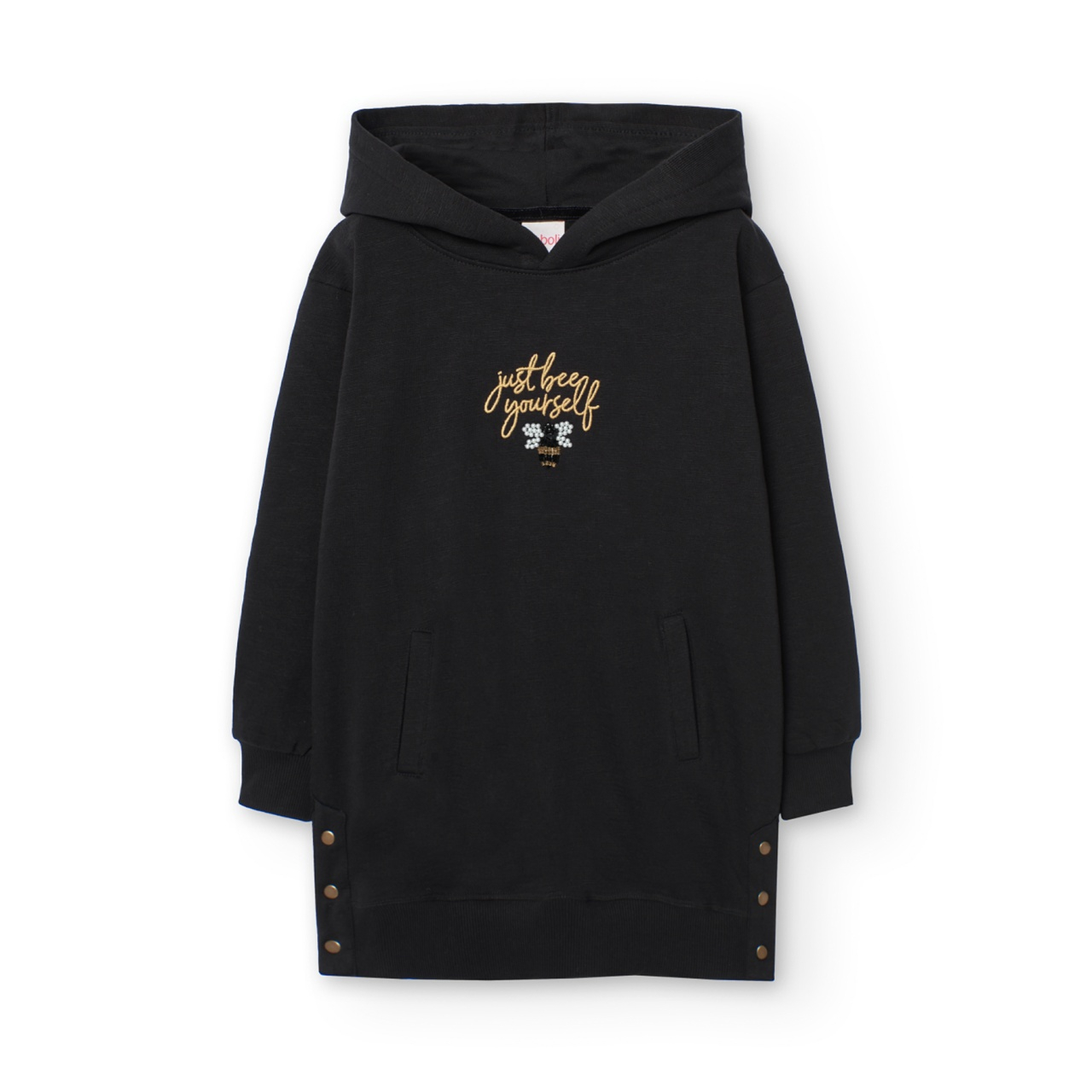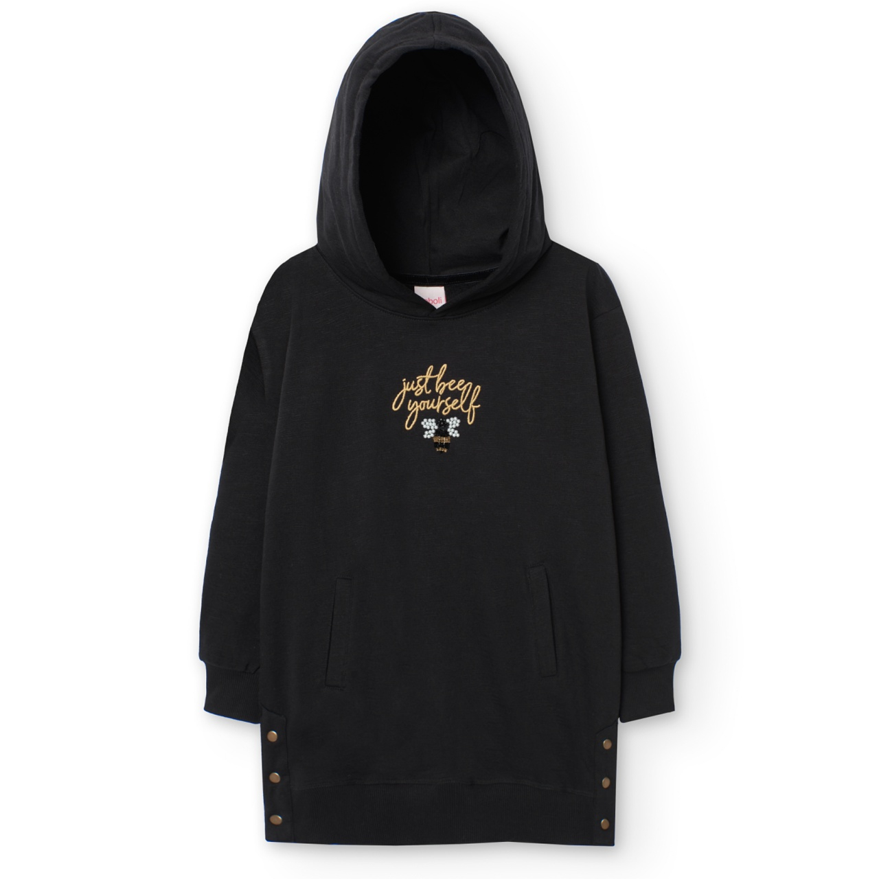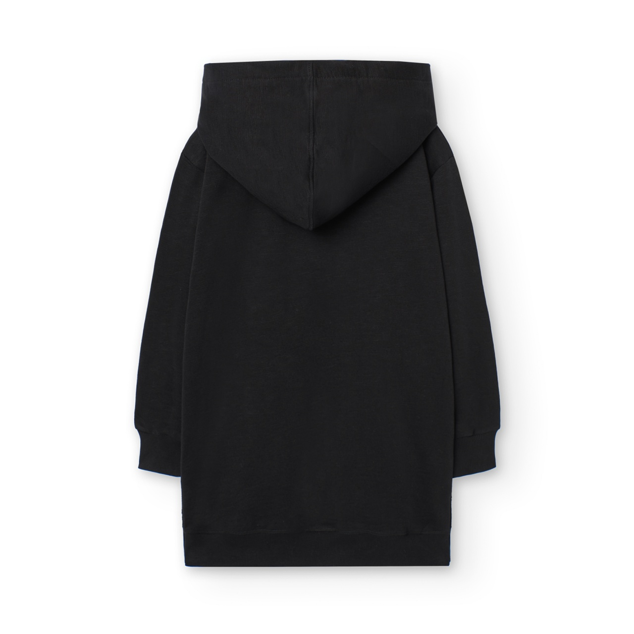 Rochie maneca lunga fete 4-16 ani, bumbac better cotton, gluga, broderie pe fata, model fluture din perle si margelute, neagra, brand Boboli.