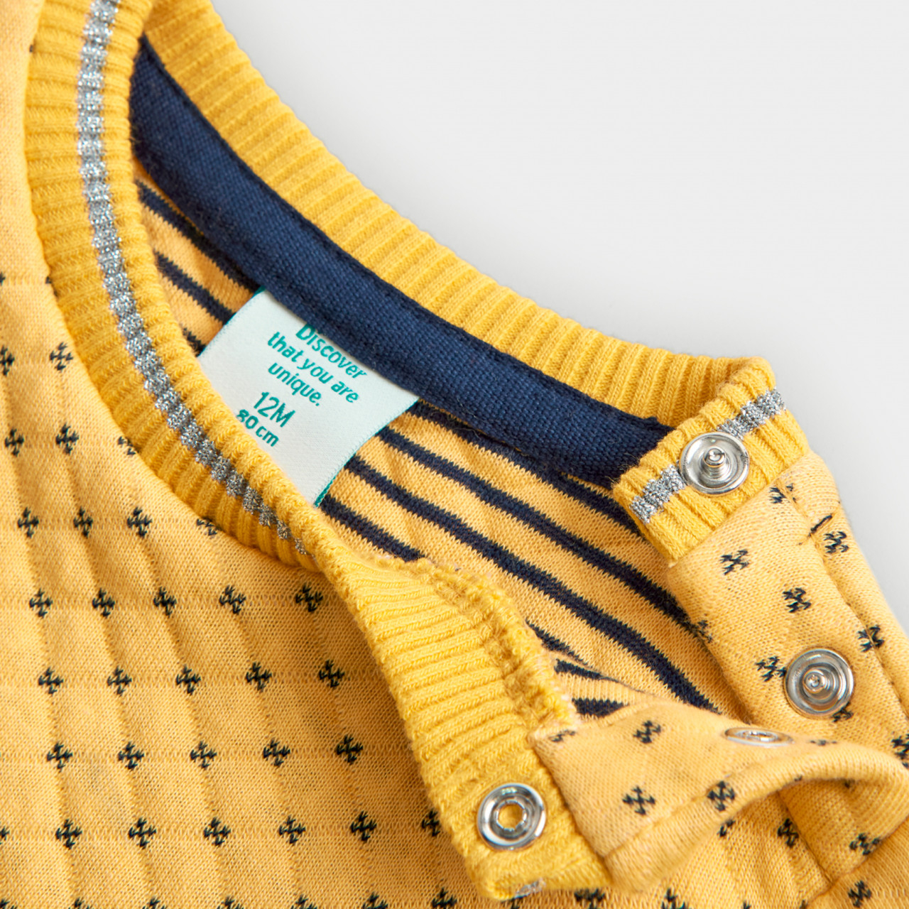 Rochie casual fetite din bumbac dublat, galbena cu steluta argintie si blanita aplicata.